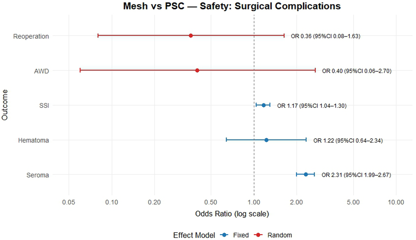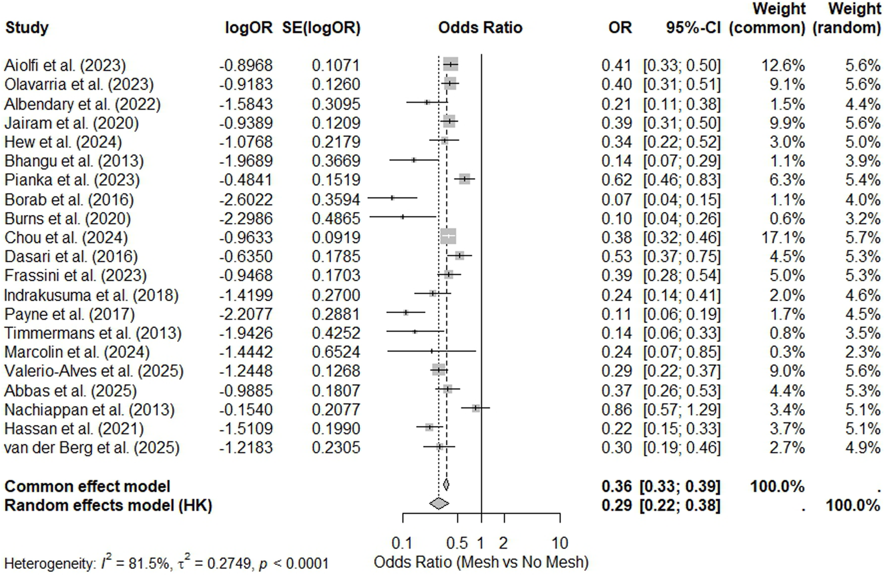 The 95% prediction interval was calculated, which estimates the expected range for the effect size of an individual future study from the same study population. The obtained interval (0.22–0.37) indicates that, with 95% confidence, the odds ratio of a new study would be observed within this range. Since the entire interval is well below 1.0, the protective effect of the prophylactic mesh was considered to be robust and consistently beneficial for preventing IH in various clinical settings.