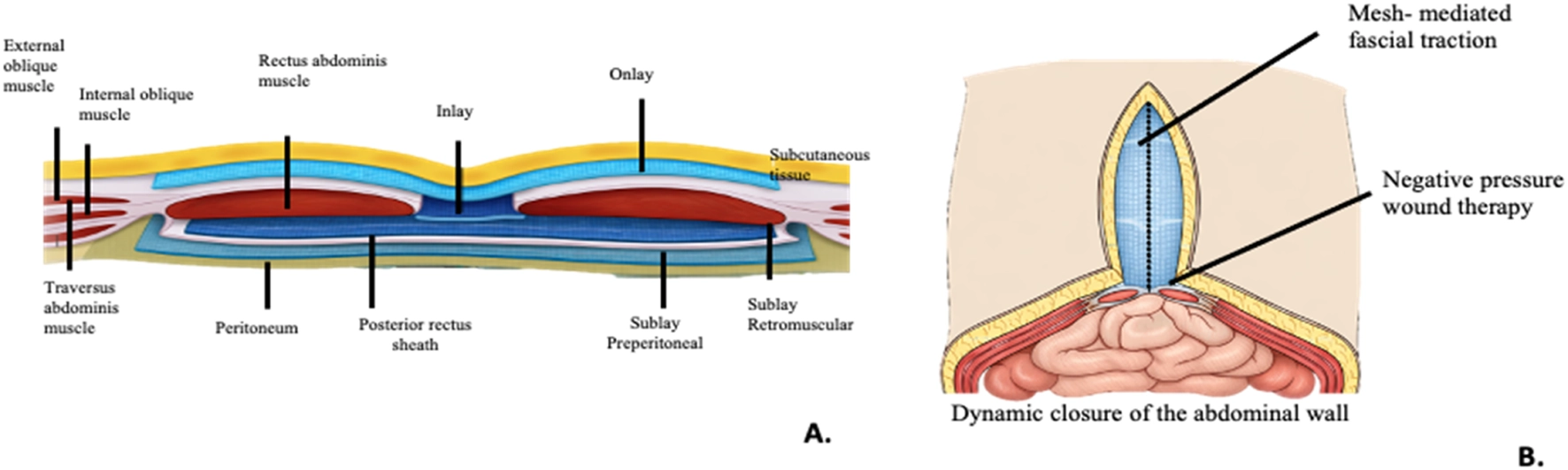 Mesh-mediated traction consisted of placing a high-density polypropylene (Prolene) mesh in. An inlay position fixed to the aponeurosis, combined with a negative pressure wound therapy system to minimize the defect and prevent lateral retraction of the abdominal muscles Figure 1B.