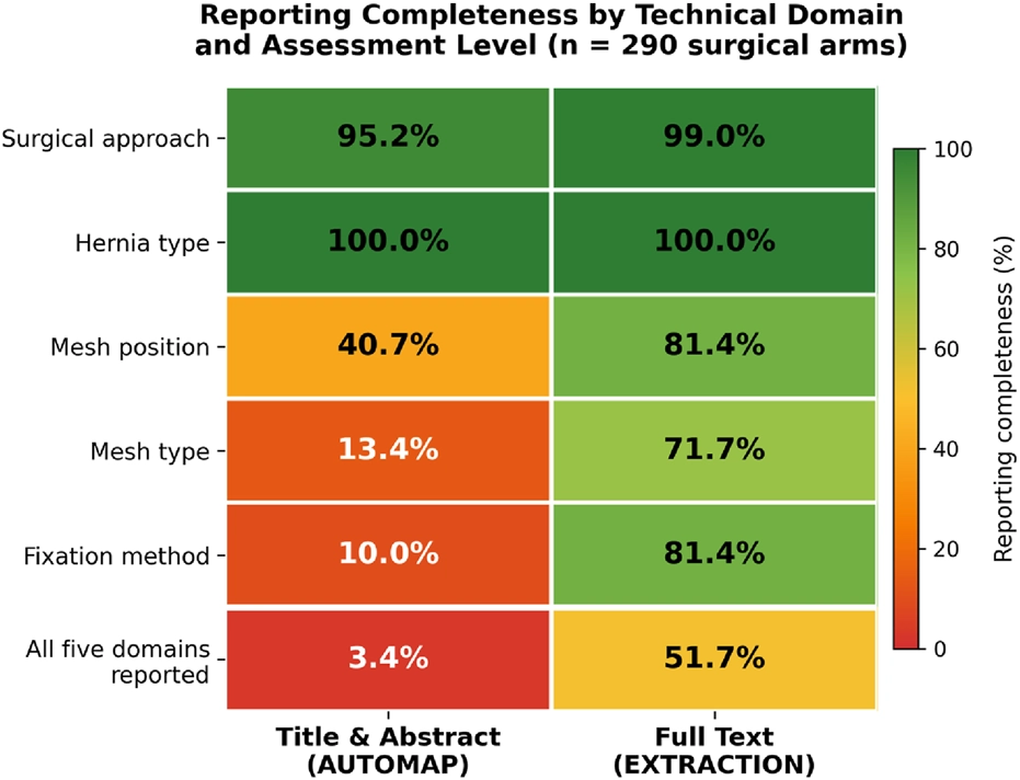 Two hundred articles comprising 290 surgical arms were analyzed. Surgical approach and hernia type were almost universally reported (≥99%). In contrast, mesh-related domains were inconsistently described, with mesh position and fixation reported in 81.4% and mesh type in 71.7% of arms. Overall, only 51.7% of techniques were fully reproducible based on full-text assessment. When limited to titles and abstracts, complete interpretability dropped to 3.4%, indicating a high risk of technical misclassification. Substantial terminological redundancy was observed, with up to 16 different acronyms used to describe identical technical configurations.