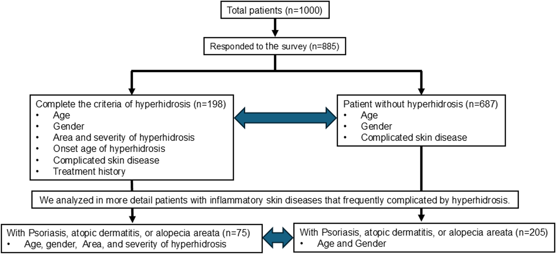 Is the outline of the present study. The population consisted of the patients who completed the questionnaire responses. We compared age, gender, and coexisting skin diseases between the hyperhidrosis group and the non-hyperhidrosis group. For the hyperhidrosis group, we also analyzed affected body areas, severity, onset age, and treatment history. Subsequently, we conducted detailed analyses of psoriasis, atopic dermatitis, and alopecia areata, which had high coexistence rates.