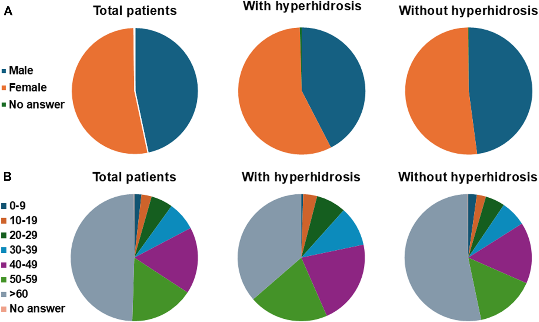 Gender (A) and age (B) of each affected area (head and face, axillary, palmar and plantar) among all hyperhidrosis patients.