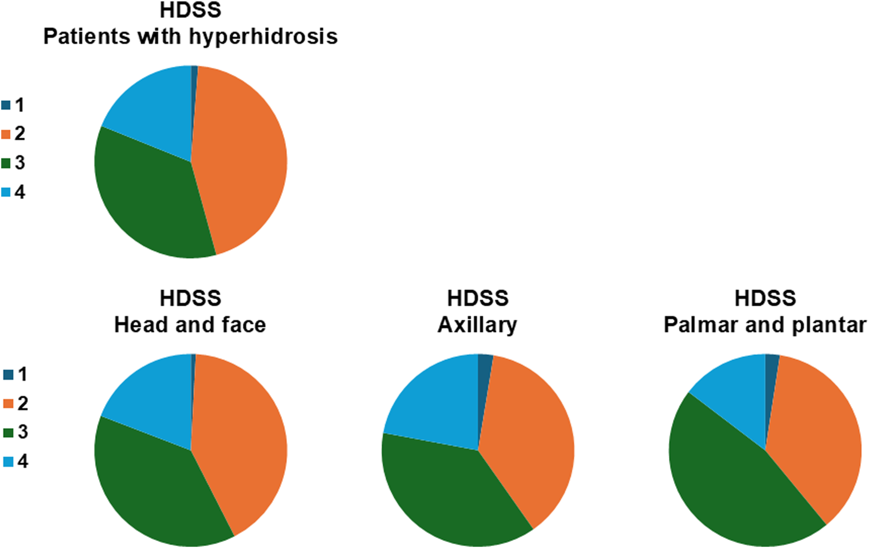 The aggregate results of HDSS were shown in Figure 4. Over half (54.3%) of the patients complained HDSS 3 or 4, which was considered severe or very severe. No significant difference was seen between head-face, axillary, and palmar-plantar groups in the percentage of patients with HDSS 3 or 4.