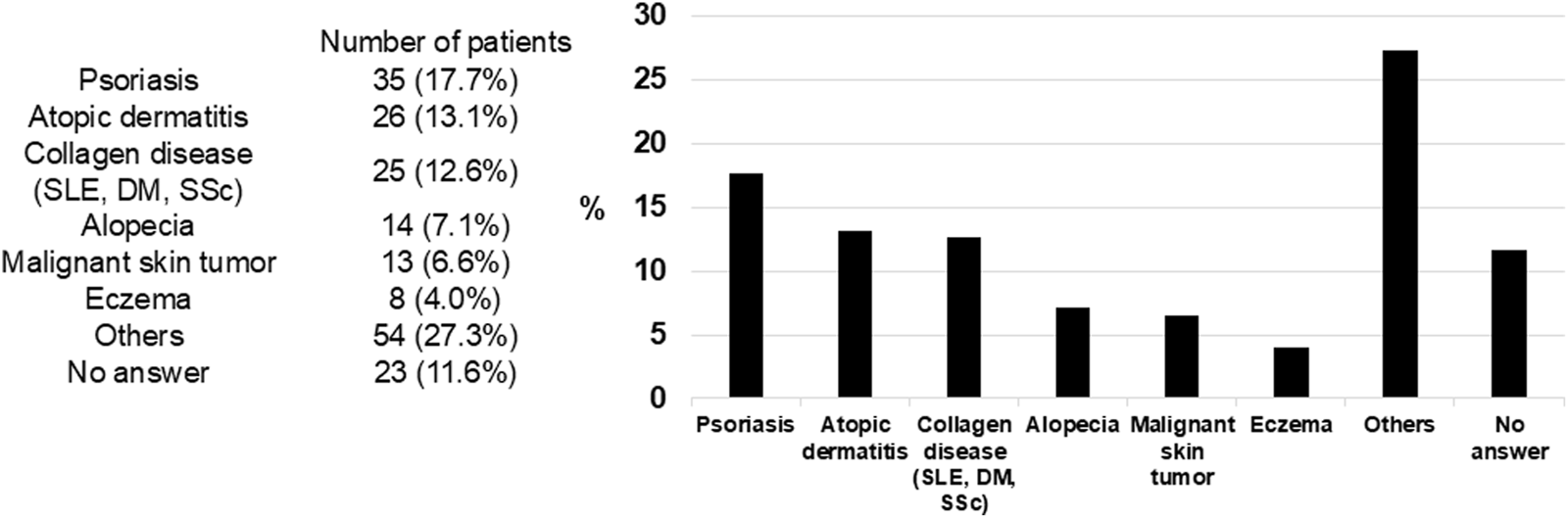The number and percentage of complicated skin diseases with hyperhidrosis. The denominator of the percentage is the total number of hyperhidrosis patients. SLE, systemic lupus erythematosus; DM, dermatomyositis; SSc, systemic sclerosis.