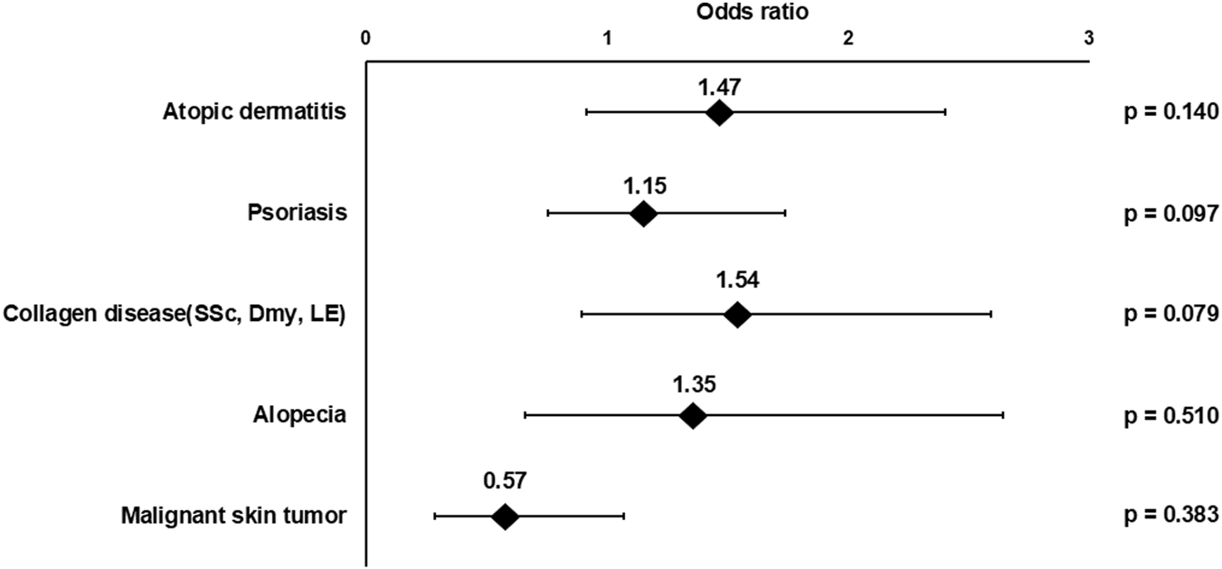 Finally, the most common skin diseases complicated with patients with hyperhidrosis were psoriasis, AD, collagen disease (Systemic lupus erythematosus; SLE, Dermatomyositis; DM, Systemic sclerosis; SSc), AA, malignant skin tumor, eczema in the order (Figure 6). The number and prevalence of hyperhidrosis patients in each disease were as follows. Psoriasis; 35 patients (17.7%), AD; 26 patients (13.1%), collagen disease; 25 patients (12.6%), AA; 14 patients (7.1%), malignant skin tumor; 13 patients (6.6%), and eczema; 8 patients (4.0%). The diseases found in only one or two patients were classified as “others”. There are no significant differences in odds ratios for each disease and hyperhidrosis (Figure 7).