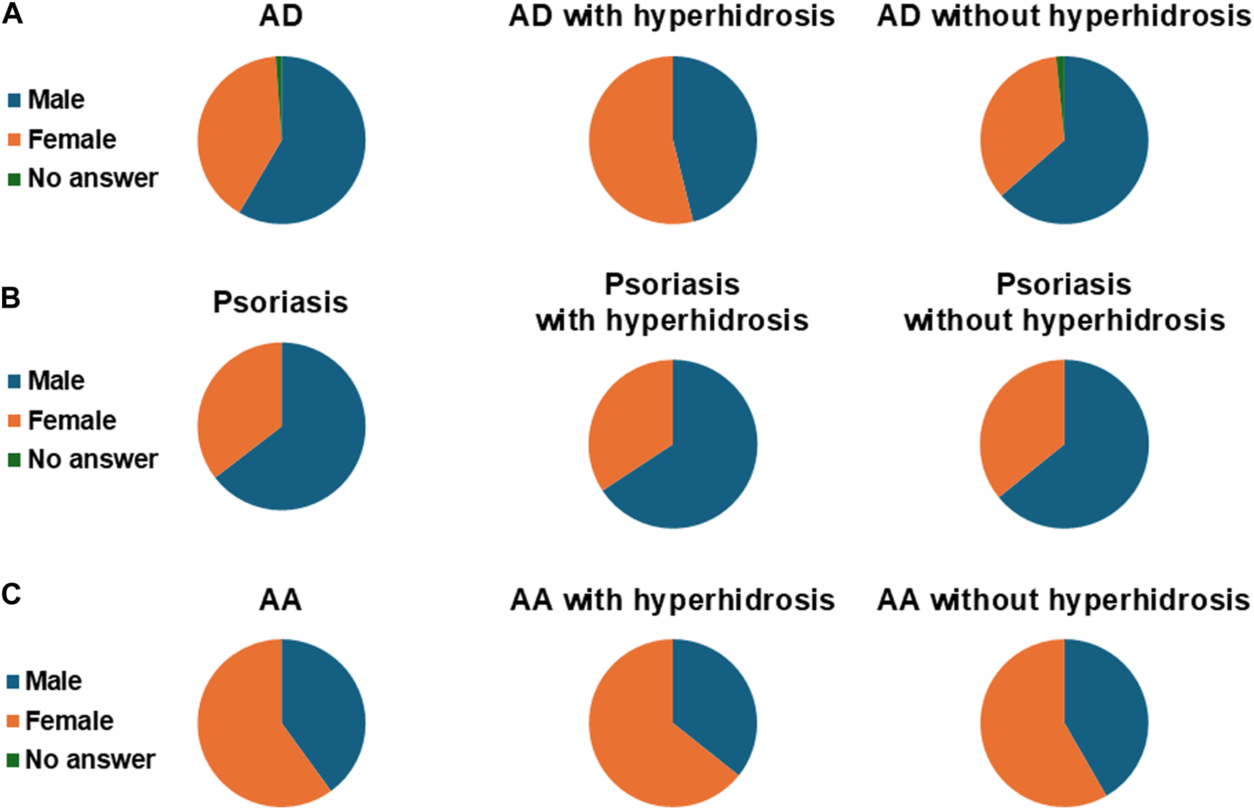 Gender of atopic dermatitis (A), psoriasis (B), and alopecia areata (C) patients who responded to the questionnaire. AD, atopic dermatitis; AA, alopecia areata.