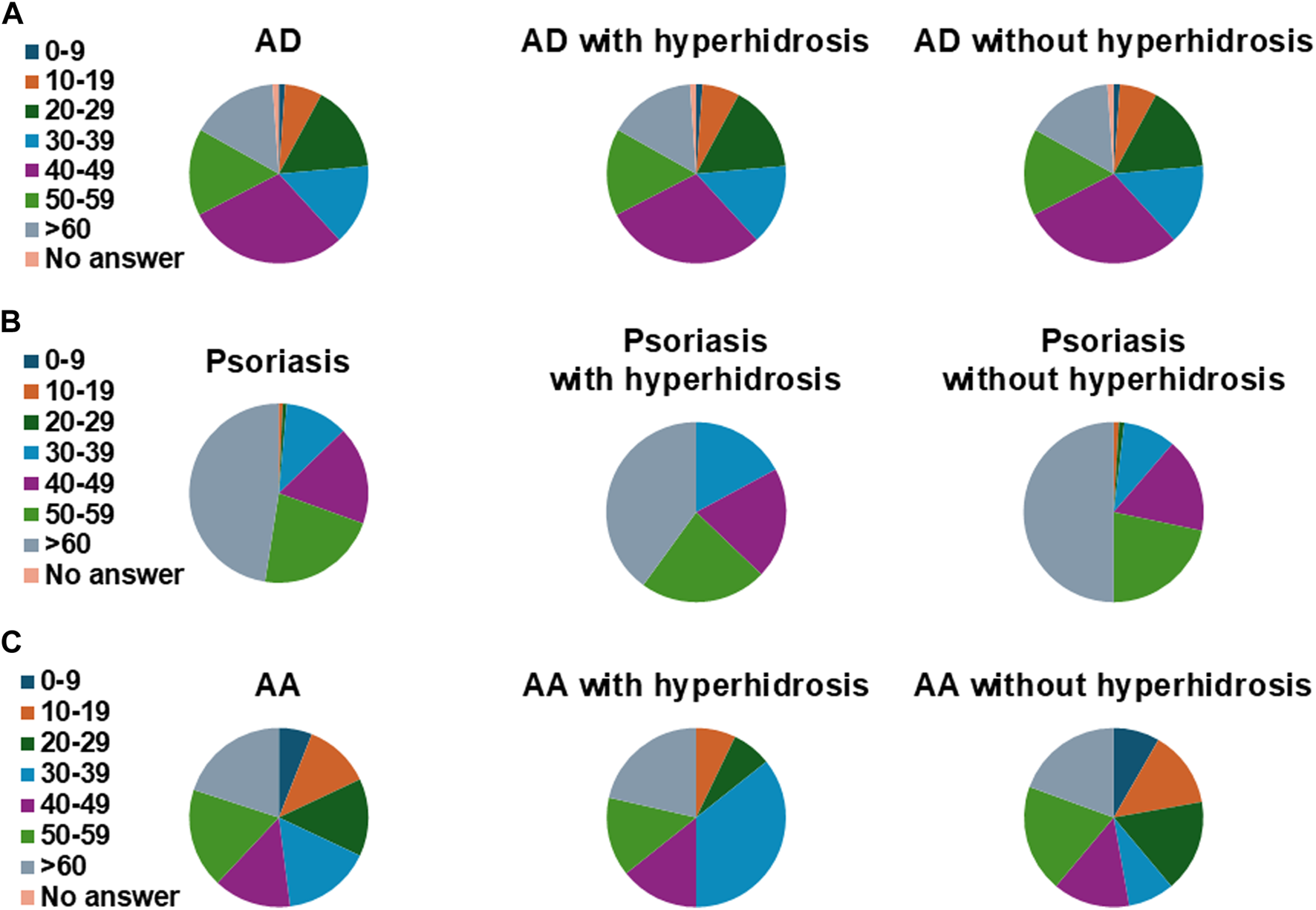 Age of atopic dermatitis (A), psoriasis (B), and alopecia areata (C) patients who responded to the questionnaire. AD, atopic dermatitis; AA, alopecia areata.