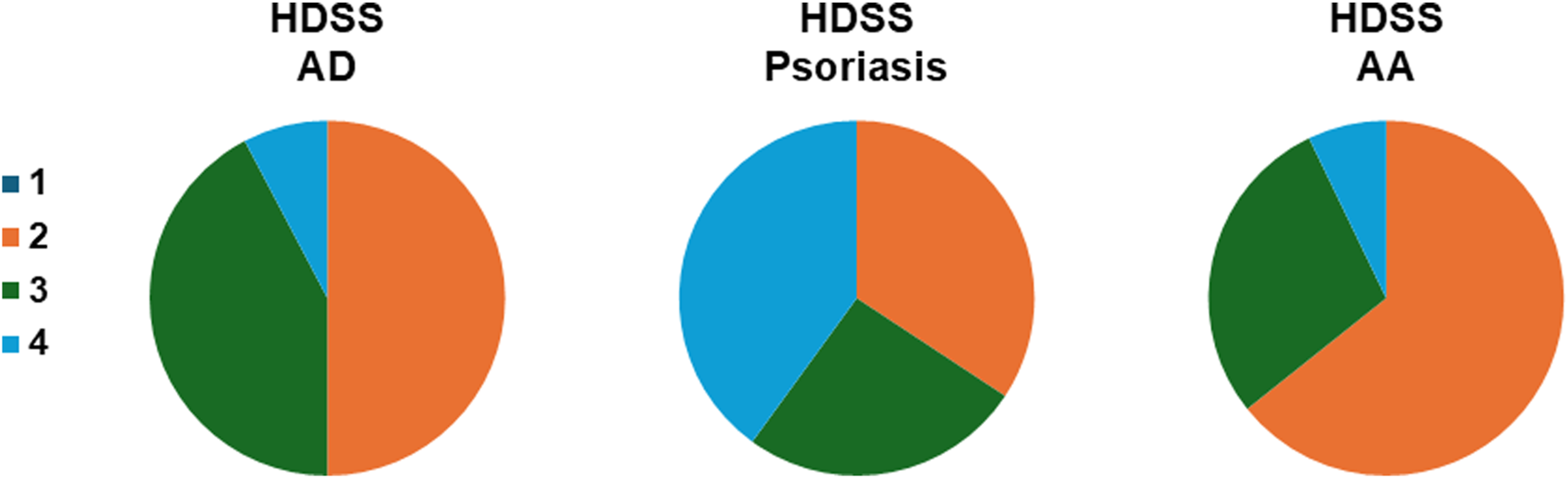 In comparison among AD, psoriasis, and AA, the percentages of patients who reported HDSS 3 or higher were 50%, 65.7%, and 35.7% (Figure 10).