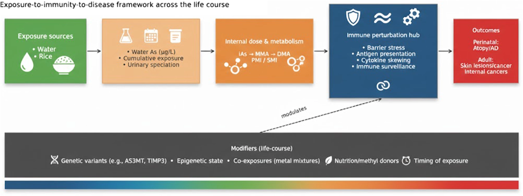 We previously summarized key epidemiologic and mechanistic evidence linking arsenic carcinogenesis to immune dysfunction [12]. The World Health Organization (WHO) identifies drinking water as a major exposure route and recommends a guideline value of 10 μg/L for arsenic in drinking water [13]. These regulatory benchmarks draw heavily on large-scale longitudinal studies from Taiwan [14]. Importantly, arsenic exposure does not act solely through direct cellular toxicity; it can reshape innate and adaptive immune function, thereby altering tissue homeostasis, inflammatory tone, and tumor immune surveillance. Since our 2019 synthesis, our group has advanced the field with population-level evidence for reduced cancer burden after mitigation, improved approaches for exposure estimation, and new insights into host susceptibility across the life course.