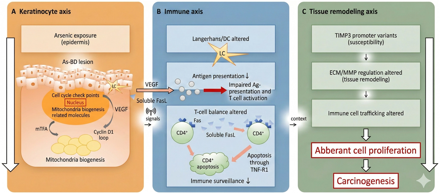 Arsenic-related outcomes span malignant and non-malignant phenotypes, suggesting systems-level disruption. Immune perturbation may connect these outcomes through four non-mutually exclusive modes: (1) barrier and epithelial stress signaling, (2) altered antigen presentation and local immune surveillance, (3) shifts in T-cell polarization and regulatory balance, and (4) epigenetic and transcriptional rewiring. These processes were synthesized in our prior review and remain useful for integrating new data [12].