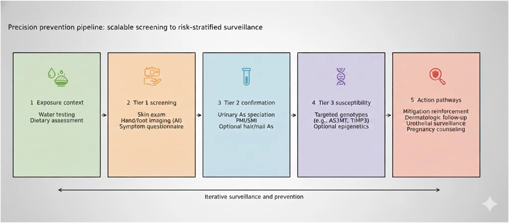 This updated synthesis supports immune perturbation as a central axis of arsenic-related health hazards, linking cutaneous carcinogenesis, internal cancers, and allergic phenotypes. Several translational points emerge. First, exposure assessment must be scalable yet context-aware: urinary speciation remains valuable but requires careful interpretation in seafood-consuming populations. At the same time, noninvasive image-based estimation may enable field-deployable screening and cohort enrichment. Second, mitigation reduces population burden but does not immediately eliminate risk; long-latency outcomes and susceptibility heterogeneity argue for targeted follow-up in previously exposed communities (Figure 3). Third, perinatal exposure represents a critical window for immune programming that may influence early allergic outcomes and potentially shape later-life inflammatory susceptibility. Finally, genetic and epigenetic susceptibility should be operationalized in risk stratification by combining metabolic indices with candidate genotypes and emerging epigenetic biomarkers. Key research gaps include human bridging studies connecting keratinocyte stress pathways to immune phenotypes in arsenical lesions, and longitudinal immunophenotyping that predicts lesion progression, recurrence, and internal cancer development.