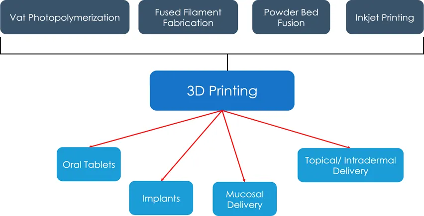 Additive manufacturing, more commonly known as 3D printing, is a process by which 3D objects are printed in a layer-by-layer fashion [2]. The most common types of 3D printing include vat photopolymerization (VPP), fused deposition modelling (FDM), powder bed fusion (PBF), inkjet writing and direct ink writing [3]. In this review, we will focus on the various types of 3D printers used to formulate modified release dosage forms with a brief description on the mechanisms of each subtype of 3D printing.