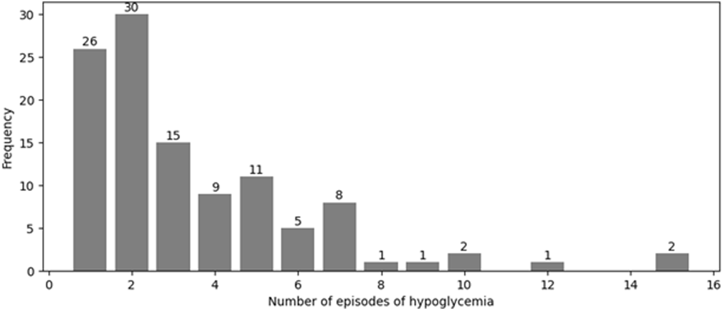 Number of episodes of hypoglycemia occurring among patients with T2DM. Each episode represents a documented event during hospital admissions between 2015 and 2020. Data were extracted retrospectively from medical records, and only events records within this period were included.