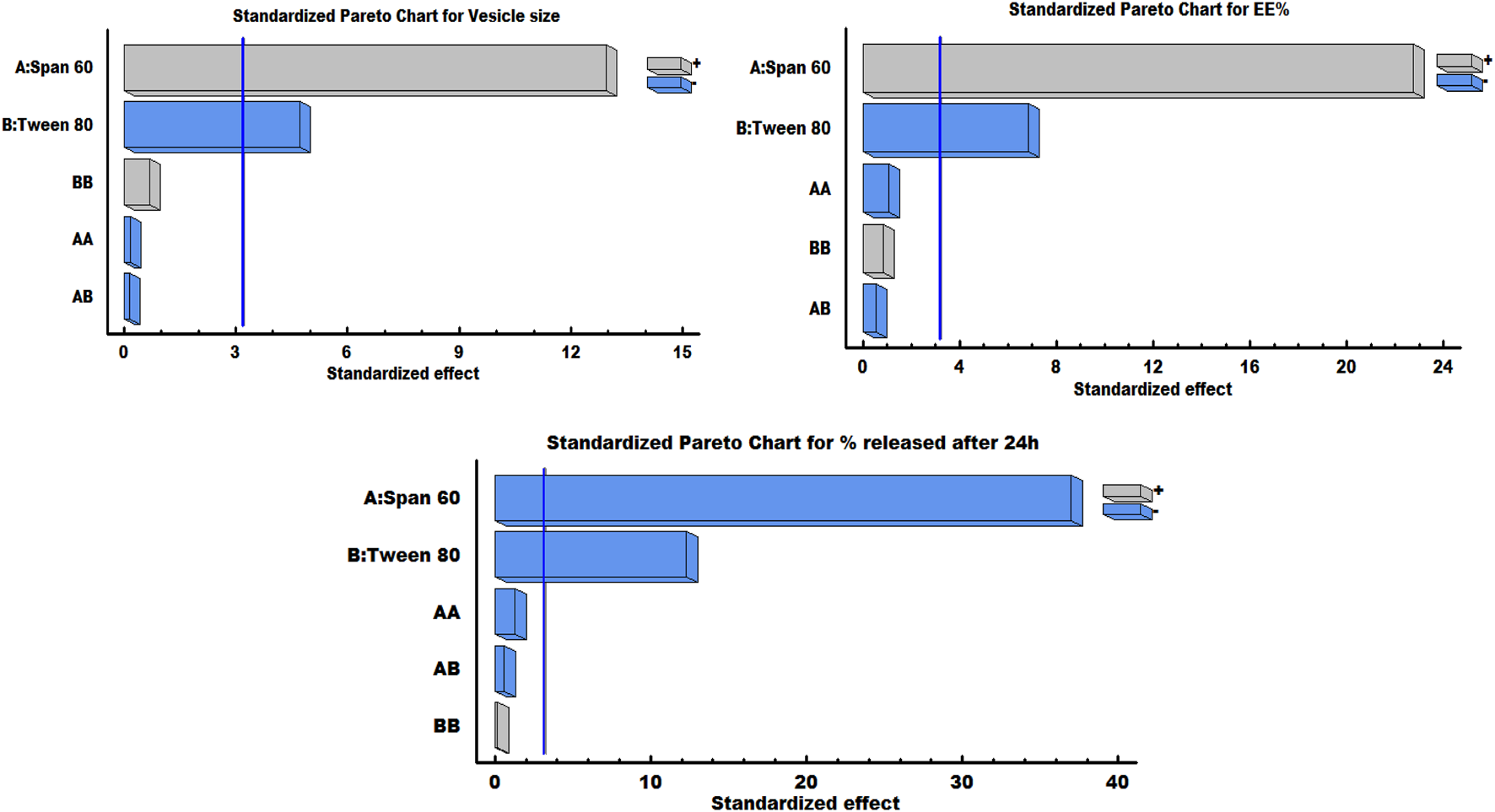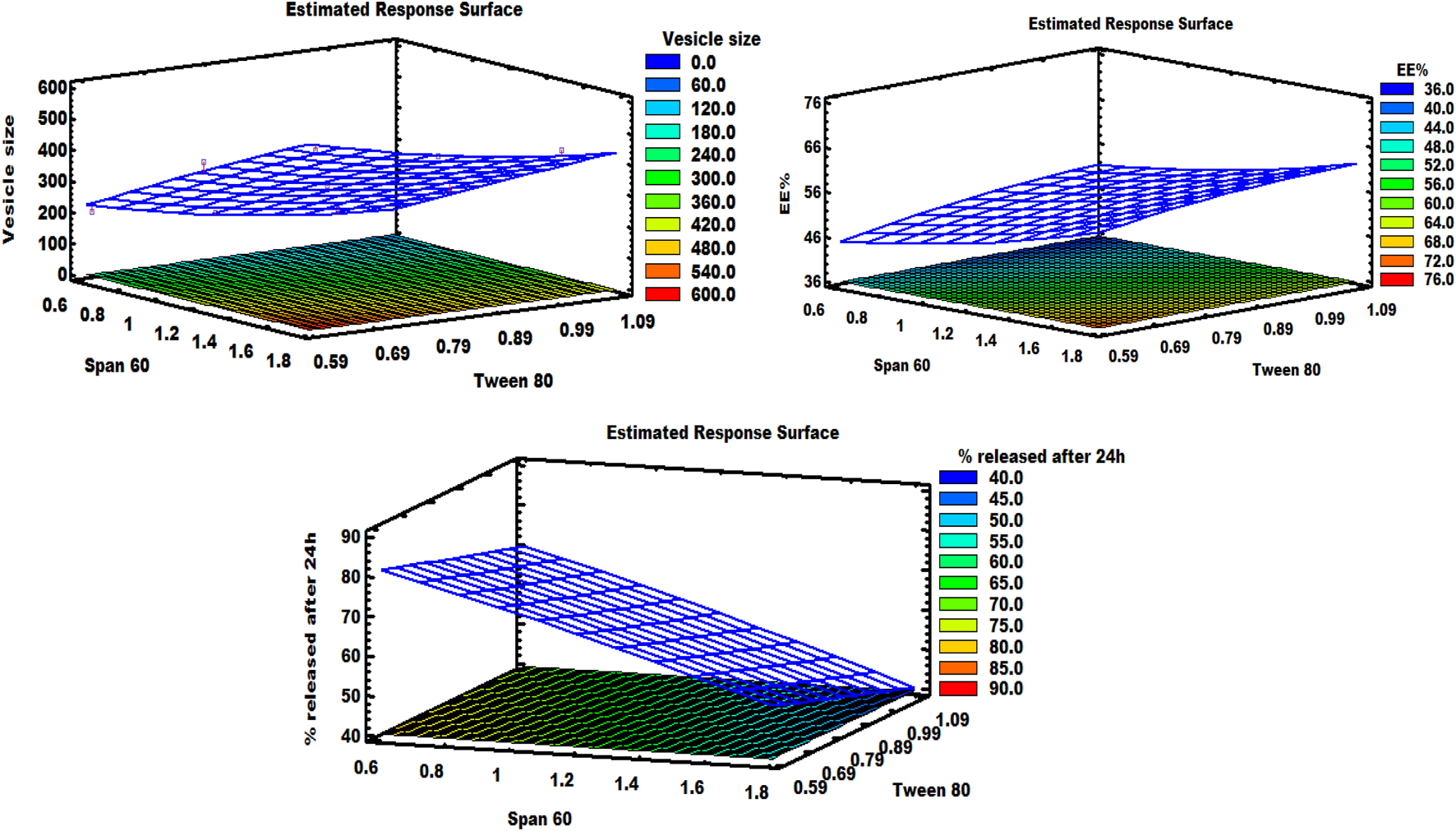 | Span 60 (%w/v) | Tween 80 (%w/v) | EE (%) | VS (nm) | % Released at 24 h (%) | ||