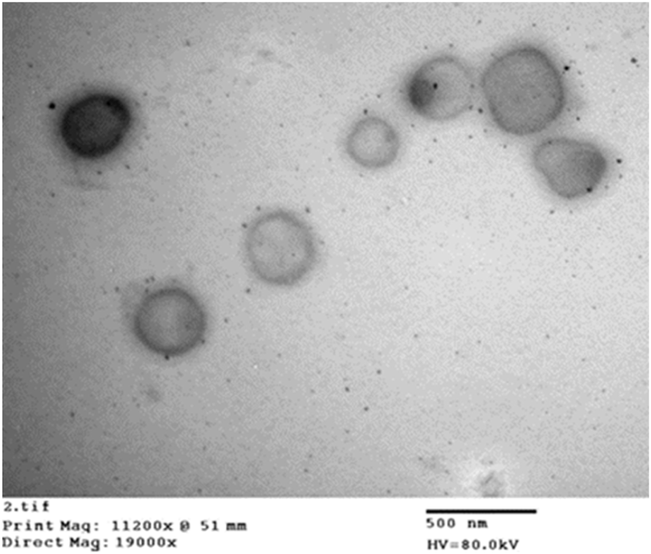 Morphology of the optimized ZLP-loaded spanlastics nanovesicles formulation was examined utilizing JEM-100 CX 11, Electron microscope, Jeol, Tokyo, Japan. An optimum volume of the diluted formulation dispersion was applied to a carbon-coated copper grid and allowed to air drying at 25 °C. The sample was then examined and photographed by TEM at 80 kV.