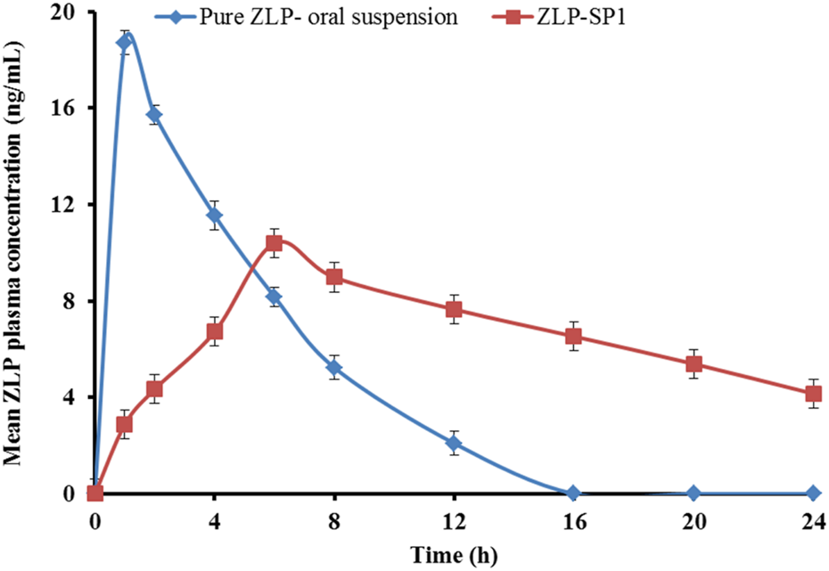 Vis, zeta potential, drug content, E %, EE %, and cumulative % ZLP amount released were presented as means ± SD and treated statistically using one-way analysis of variance (ANOVA). The statistical significance of differences between the pharmacokinetic parameters of the selected transdermal patches and ZLP oral suspension was determined using one-way analysis of variance (ANOVA). The area under the curve (AUC) assessment was conducted using trapezoidal rule with baseline correction. P < 0.05 was considered statistically significant.