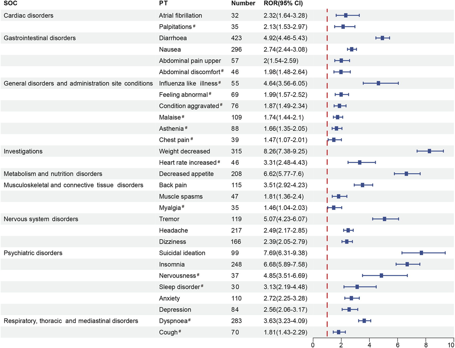 | SOC | Case number | ROR (95% Cl) | PRR (χ2) | EBGM (EBGM05) | IC (IC025) |