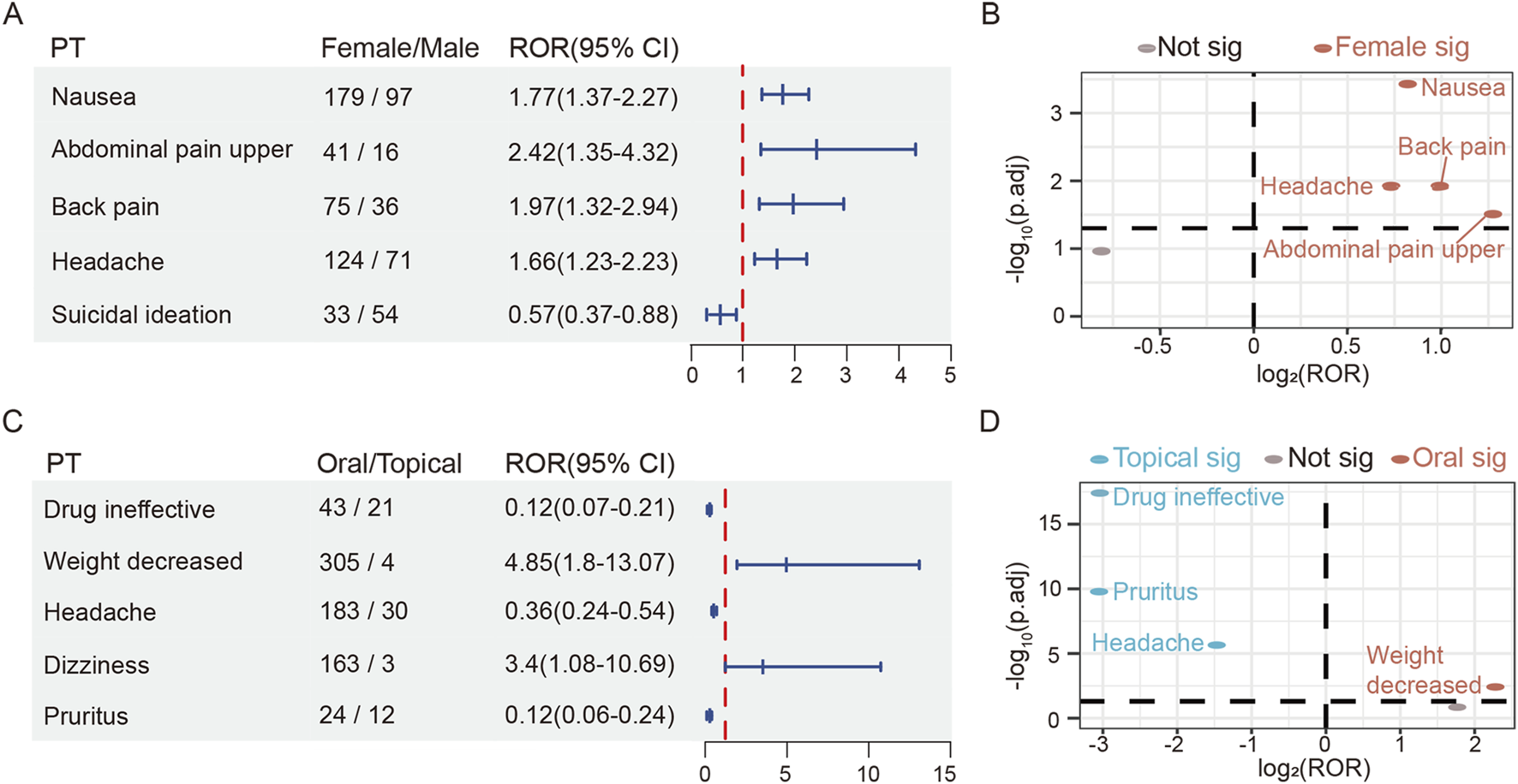 In this study, we utilized four standard disproportionality metrics: Reporting Odds Ratio (ROR), Proportional Reporting Ratio (PRR), Bayesian Confidence Propagation Neural Network (BCPNN), and Multi-item Gamma Poisson Shrinker (MGPS). The two-by-two contingency table formulas and detailed calculation methods are provided in Supplementary Tables S1, S2. Significant signals that met at least one of the four analysis methods were considered as roflumilast-associated positive AEs. Among the four methods, the ROR performs well in sensitivity and early detection, the PRR offers high specificity, the BCPNN supports multi-source data integration and cross-validation, and the MGPS excels in identifying signals for rare events [20, 21]. This study comprehensively applies the four algorithms to detect drug safety signals more comprehensively and reliably. Higher values suggested a stronger link between the drug and the occurrence of AEs. Due to the small number of reports with roflumilast in CVARD database, subgroup analysis results couldn’t be effectively output. Subgroup analyses were performed for reports in the FAERS database (Supplementary Table S3). A lower limit of the 95% CI of the adjusted ROR >1 indicated greater probability of AE relevance in the target group, while 0 < 95% CI of the adjusted ROR <1 suggested higher relevance in the control group. The p value was corrected by the false discovery rate method. Adjusted p value (p.adj) < 0.05 indicated that the difference was statistically significant. R software (version 4.4.2) was applied for all statistical assessments.