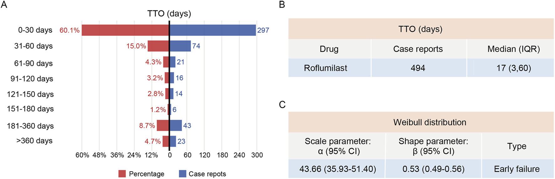 We calculated the time-to-onset (TTO) of AEs as the interval between roflumilast initiation and AE occurrence. TTO data were summarized using median with interquartile range (IQR). We employed Weibull distribution modeling (parameters α and β) to characterize time-dependent risk patterns [19]. The scale parameter (α) indicates the spread of distribution, whereas the shape parameter (β) describes the curve’s form. An early failure-type pattern is indicated when β < 1 and its 95% confidence interval (CI) < 1, suggesting a decreasing risk over time. A random failure-type pattern is inferred when β is close to 1 and its 95% CI includes 1, reflecting a constant hazard. A wear-out failure-type pattern is identified when β > 1 and its 95% CI excludes 1, indicating an increasing risk over the course of treatment.