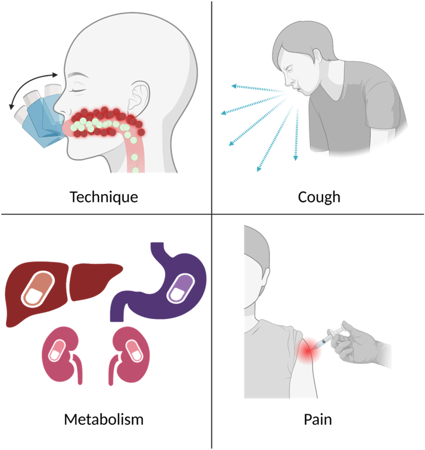 Asthma treatments are primarily delivered via inhaled or oral dosage forms, though injectable or intravenous therapies may also be necessary. While inhaled medications are often preferred for respiratory diseases, there are challenges affecting drug disposition in the respiratory tract including improper inhaler technique or coughing resulting from inhaled medications, leading to lowered medication efficacy (Figure 1) [12–17].