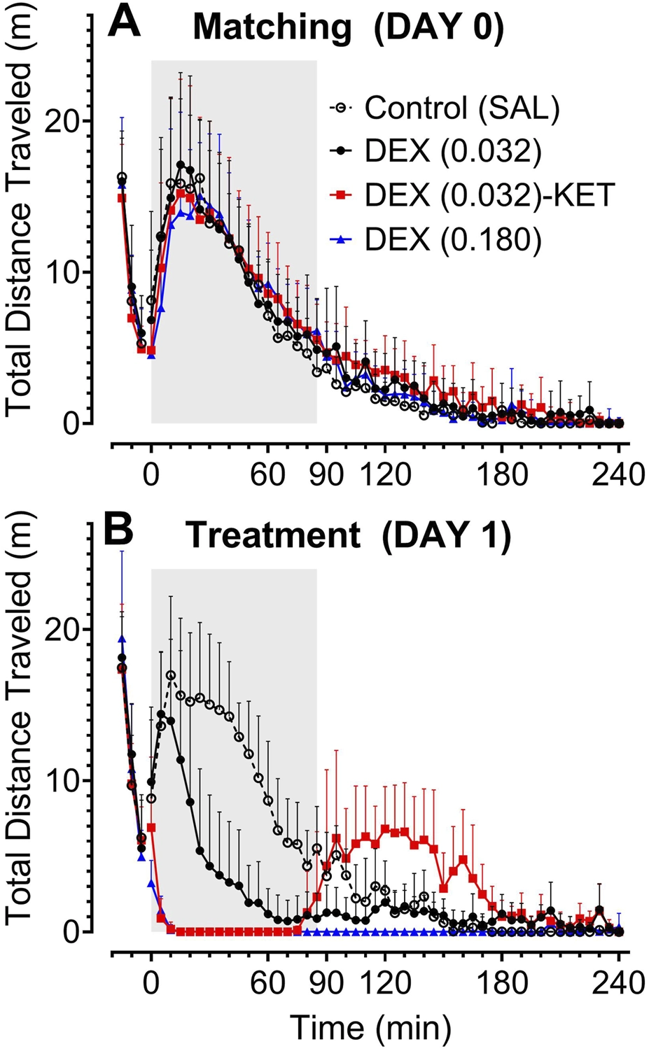 For this study, we elected to focus on the interaction between DEX and KET in safely and effectively attenuating METH-induced agitation and therefore did not include fentanyl-METH co-administration and naloxone reversal in combination with DEX ± KET treatment. In addition, this study design provided a more rigorous test of the combination in the context of ongoing METH-induced locomotion. This is in contrast to our initial DEX-NLX study, in which locomotor activity was inhibited as it was more gradually unmasked from fentanyl-induced sedation by naloxone [25]. The current study, therefore, simulates a clinical scenario in which DEX ± KET is administered after naloxone unmasks agitation in a fentanyl-METH co-intoxicated patient. In humans, this would most likely occur when or before peak naloxone concentrations are reached, typically within 15–30 min of intranasal administration [41]. We hypothesised that the combination of low-dose DEX with adjunctive KET could produce a more intense, less arousable early sedation in METH-intoxicated rats than high-dose DEX, with a superior adverse effects profile.