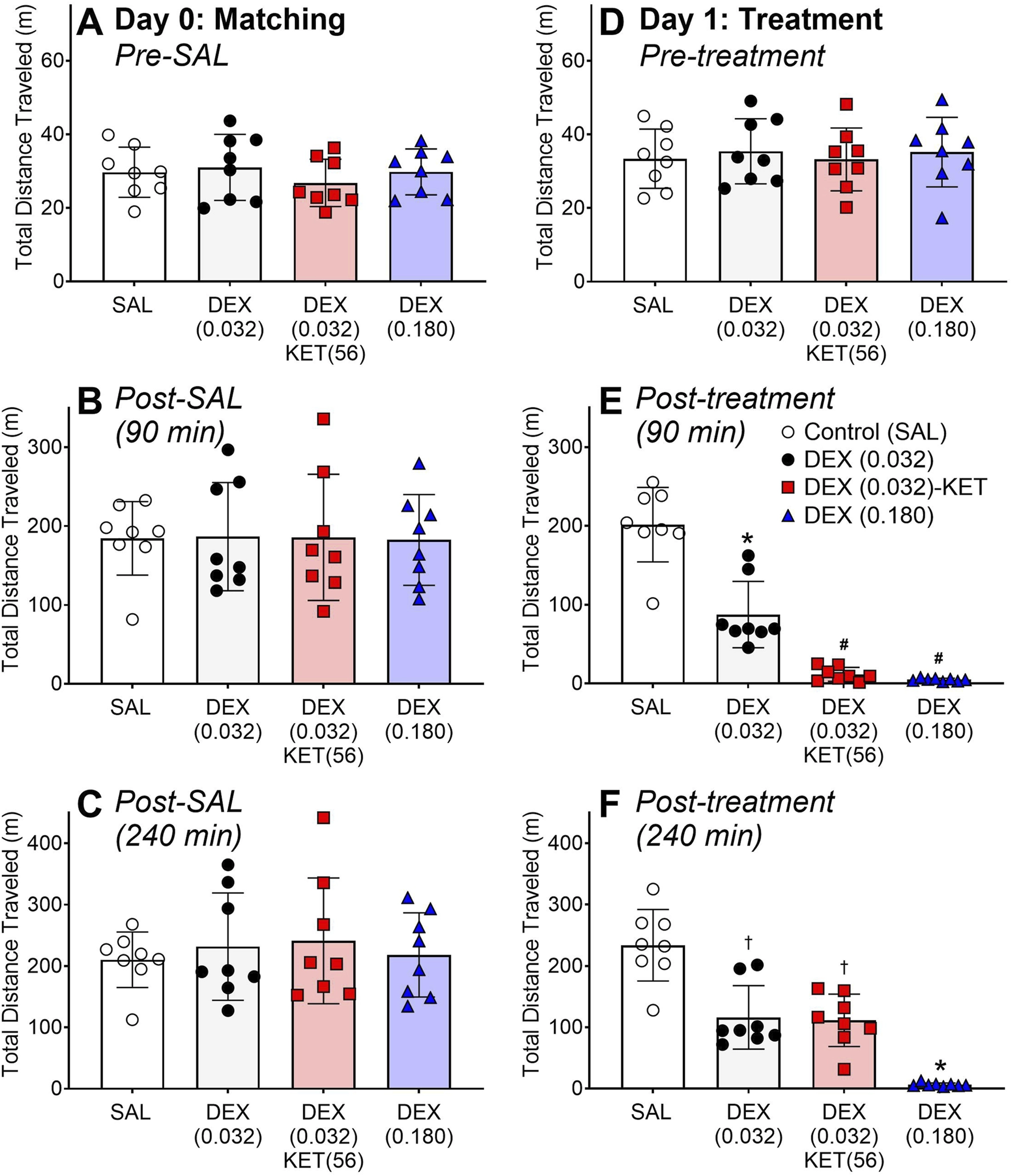 The data resulting from the dose verification locomotor activity study are reported in Supplementary Material 1. The overlapping pre-treatment day 0 METH-induced locomotor activity over time profiles (Figure 1A) and the lack of significant differences in total distance travelled data (Figures 2A–C) demonstrate that the rats were effectively divided into treatment groups. As expected, on day 1, pre-treatment METH-induced locomotor activity was similar between groups (Figure 1B [-15–1 min] and Figure 2D). The treatments substantially altered the METH-induced locomotor activity over time profile (Figure 1B [0–240 min]) resulting in significant differences between groups in total distance travelled in both the 90- (Figure 2E; F [3, 12] = 51.95, p < 0.0001) and 240-min (Figure 2F; F [3, 11.74] = 61.29, p < 0.0001) post-treatment periods. Low-dose DEX (0.032) alone significantly reduced METH-induced locomotor activity, while high-dose DEX (0.180) both significantly and almost completely reduced this activity over the entire 240-min trial (Figures 1B, 2E,F). Low-dose DEX (0.032) plus adjunctive KET effectively and almost completely attenuated METH-induced locomotor activity in the targeted 90-min post-treatment period; however, the emergence of post-sedation locomotor activity resulted in a smaller but significant overall effect in the full 240-min trial. Plots for individual rat activity are reported in Supplementary Material 2.