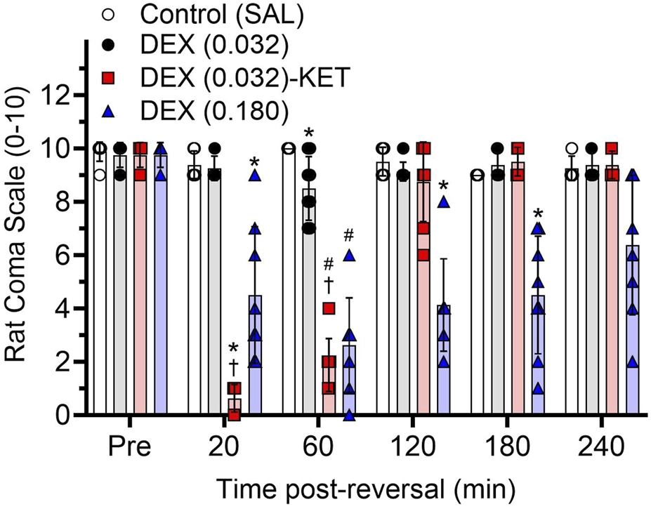 On day 1, the locomotor study was repeated with four groups administered either low-dose (0.032 mg/kg) DEX, low-dose DEX +56 mg/kg KET, high-dose (0.18 mg/kg) DEX, or SAL control 15 min after METH administration (n = 8/group). DEX doses were determined based on preliminary studies (0.01 – 0.18 mg/kg), which showed that 0.032 mg/kg DEX significantly reduced 1 mg/kg METH-induced locomotor activity, while 0.18 mg/kg DEX almost completely eliminated activity during the 240-min trial. This was followed by a preliminary study of adjunctive KET (10 – 100 mg/kg) in combination with 0.032 mg/kg DEX. This confirmed that the addition of 56 mg/kg of KET produced the most prolonged reduction in activity with the least post-sedation KET emergence response. Since the administration of 56 mg/kg of KET 15 min after METH and in the absence of DEX resulted in intense stereotypy followed by an enhanced peak locomotor effect, a KET-alone treatment group was excluded from the study. The methods and results of the small locomotor study (n = 4/group) performed to qualitatively verify the locomotor attenuating effects of the chosen DEX ± KET doses are reported in Supplementary Material 1. Treatment doses were prepared by a separate researcher to blind the researcher performing the rat coma scale scoring to the treatment administered. DEX and KET were administered separately at distinct sites due to poor compatibility in solution [53]. SAL was injected in place of KET in the non-KET-treated groups to maintain blinding for coma scale scoring on day 7 or 8 and to ensure a consistent number of injections between groups. After treatment, 240 min of activity were measured.