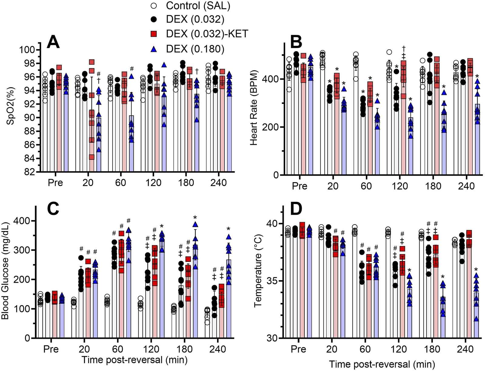 High-dose DEX (0.180) produced significant reductions in SpO2 compared to the SAL control and/or low-dose DEX (0.032) groups at 20, 60, and 180 min post-treatment (Figure 4A). However, these reductions were not substantial, with full recovery to baseline occurring at the end of the 240-min trial (F [7.693, 71.80] = 3.461, p = 0.0023). All treatments resulted in significant reductions in heart rate (Figure 4B, F [10.52, 98.16] = 17.96, p < 0.0001). High-dose DEX (0.180) produced the most intense reductions, which persisted throughout the 240-min trial. While the less intense but still significant low-dose DEX (0.032)-induced reduction in heart rate recovered to baseline by 180 min, the addition of KET resulted in both a smaller reduction (as evidenced by the significantly higher heart rate compared to low-dose DEX alone between 20 and 120 min) and a more rapid return to baseline by 120 min. There was a substantial and significant increase in blood glucose in all three treatment groups (Figure 4C, F [7.822, 73.01] = 22.63, p < 0.0001). These higher levels, while still significantly elevated compared to the SAL control, largely recovered in the low-dose DEX (0.032) ± KET groups but remained substantially higher in the high-dose DEX (0.180) group at the conclusion of the 240-min trial. There was a substantial and significant reduction in temperature in all treatment groups (Figure 4D, F [8.027, 74.92] = 50.51, p < 0.0001). A minor but significant reduction in temperature was detected 20 min post-treatment in the low-dose DEX (0.032)-KET and high-dose DEX (0.180) groups, with substantial reductions compared to the SAL control group present in all three treatment groups by 60 min. Temperature fully recovered in the DEX (0.032) ± KET groups by the conclusion of the trial, 240 min post-treatment. High-dose DEX (0.180)-induced temperature reductions, however, did not return to baseline and remained significantly lower than all other groups between 120 and 240 min.