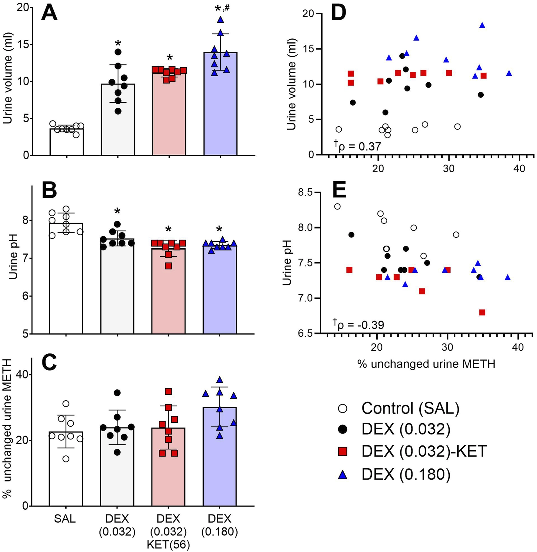 All three treatments resulted in substantial and significant increases in urine volume (Figure 5A, F [3, 15.15] = 46.46, p < 0.0001) and significant reductions in pH (Figure 5B, F [3, 28] = 18.09, p < 0.001) compared to the SAL control, with high-dose DEX (0.180) significantly increasing urine production compared to low-dose DEX (0.032). While DEX did not significantly enhance the elimination of unchanged renal METH in any group, there was a trend towards increased elimination resulting from the high-dose DEX (0.180) treatment (Figure 5C, F [3, 28] = 2.782, p = 0.0594). There was a moderate, significant positive correlation between the percentage of unchanged METH excreted in urine and urine volume (Figure 5D, ρ = 0.37, p = 0.0351), along with a moderate, significant negative correlation between the percentage of unchanged METH excreted in urine and urine pH (Figure 5E, ρ = −0.39, p = 0.0287).