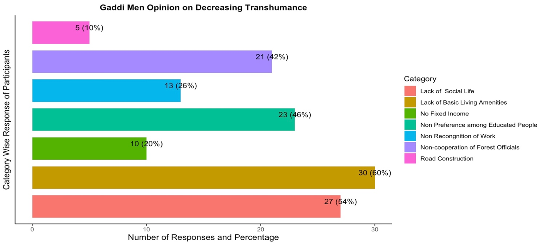 It must be noted that the age of the youngest man was 35 years. This indicates a generational shift in livelihood preferences among the Gaddi tribe. The age distribution suggests that the youth are moving away from this traditional practice of Transhumance while the older men continue to maintain this practise. A 76- year-old Gaddi man from Bandla village stated that, “I cannot leave this profession, if I leave this profession, I may not live long.” This was the common view of majority of the older men who were still practising the Transhumance profession. One of the respondents stated that “Only death will make us apart from this profession.”