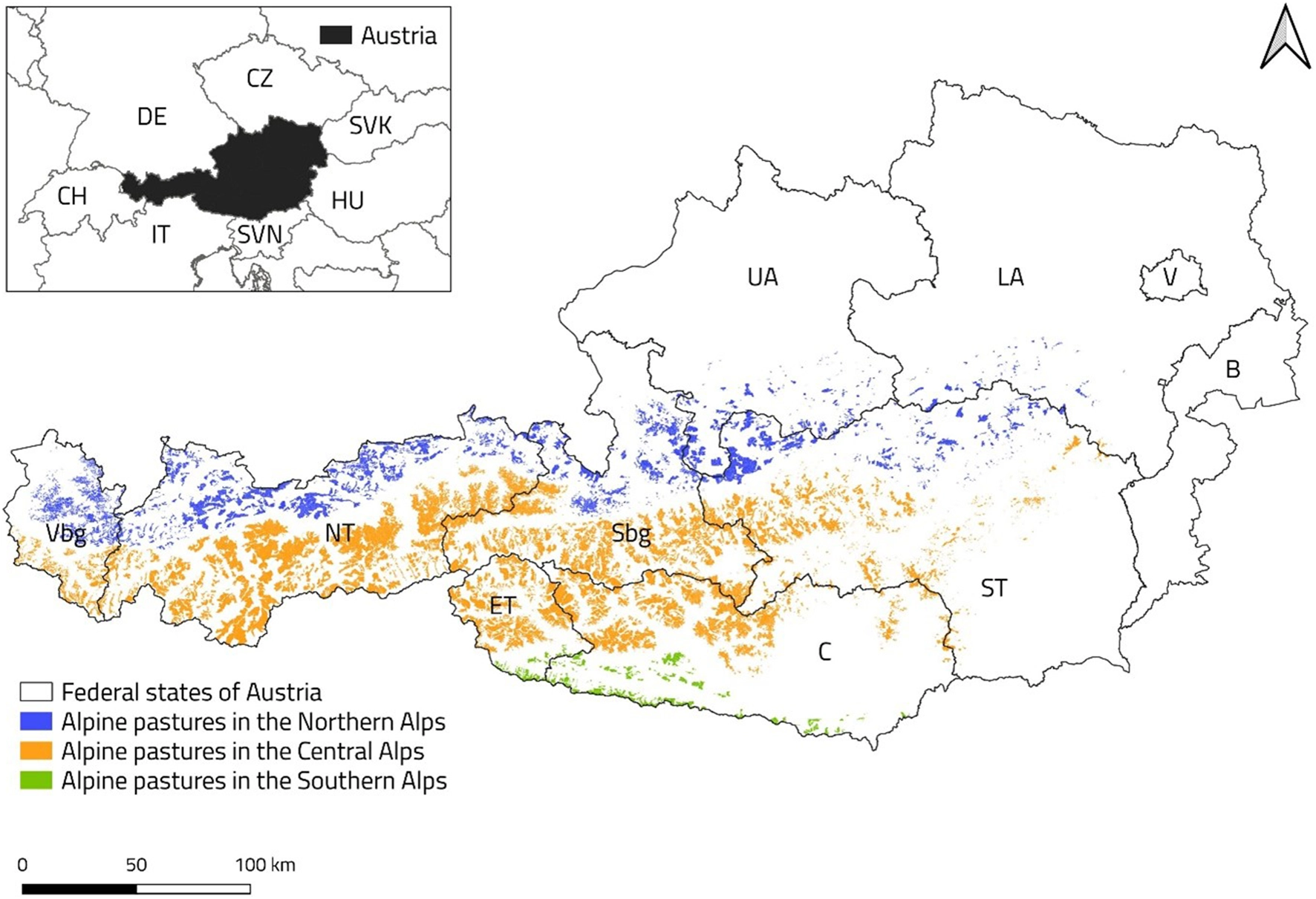 To calculate the maximum stocking rate for suitable areas in each pasture we used the maximum stocking rate and the suitability of the area. Based on the direct payment ordinance from Switzerland (Bundesamt für Landwirtschaft, 2022) the maximum stocking rate depended on Alpine regions (northern, central and southern Alps), forage quality (–more or less productive) and altitude. Austrians also use some calculations similar to the Swiss direct payment ordinance, but these calculations are not publicly available. Switzerland is adjacent to Austria and we assume that these values also will hold for Austria. We have used the livestock units (hereinafter LU) values that apply from 2024 on in the direct payment ordinance. Only the values for less productive pastures were used in the further calculations since no data on the productivity of the pastures are available. The capacity for less productive pastures is not much more than 50% of more productive pastues, making it very conservative.
