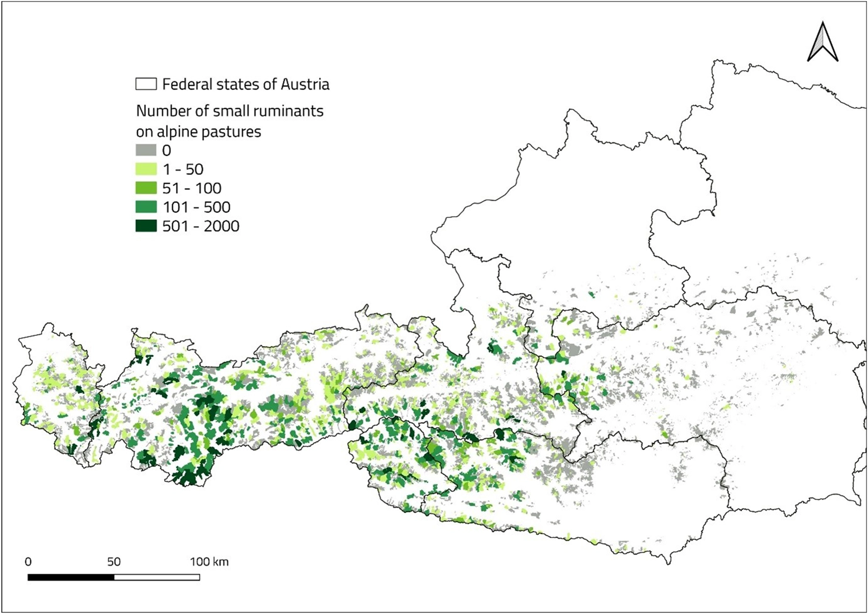 In 2022 small ruminants (sheep and goats, SmRu) were present on 1,325 out of 8,072 alpine pastures (16%) (Austrian Federal Ministry of Agriculture, BML, 2024). Most of the SmRu herds (60%) number between 1 and 50 animals and are found on alpine pastures in the Central Alps, especially in Tyrol (Figure 2). They are often located in in remote, steep pastures with low productivity, as these areas are not suitable for cattle.
