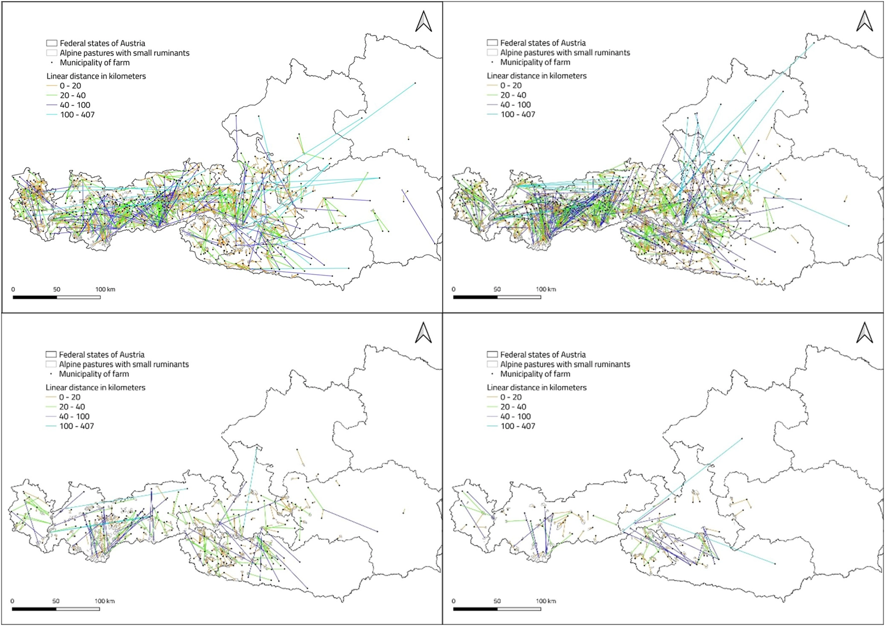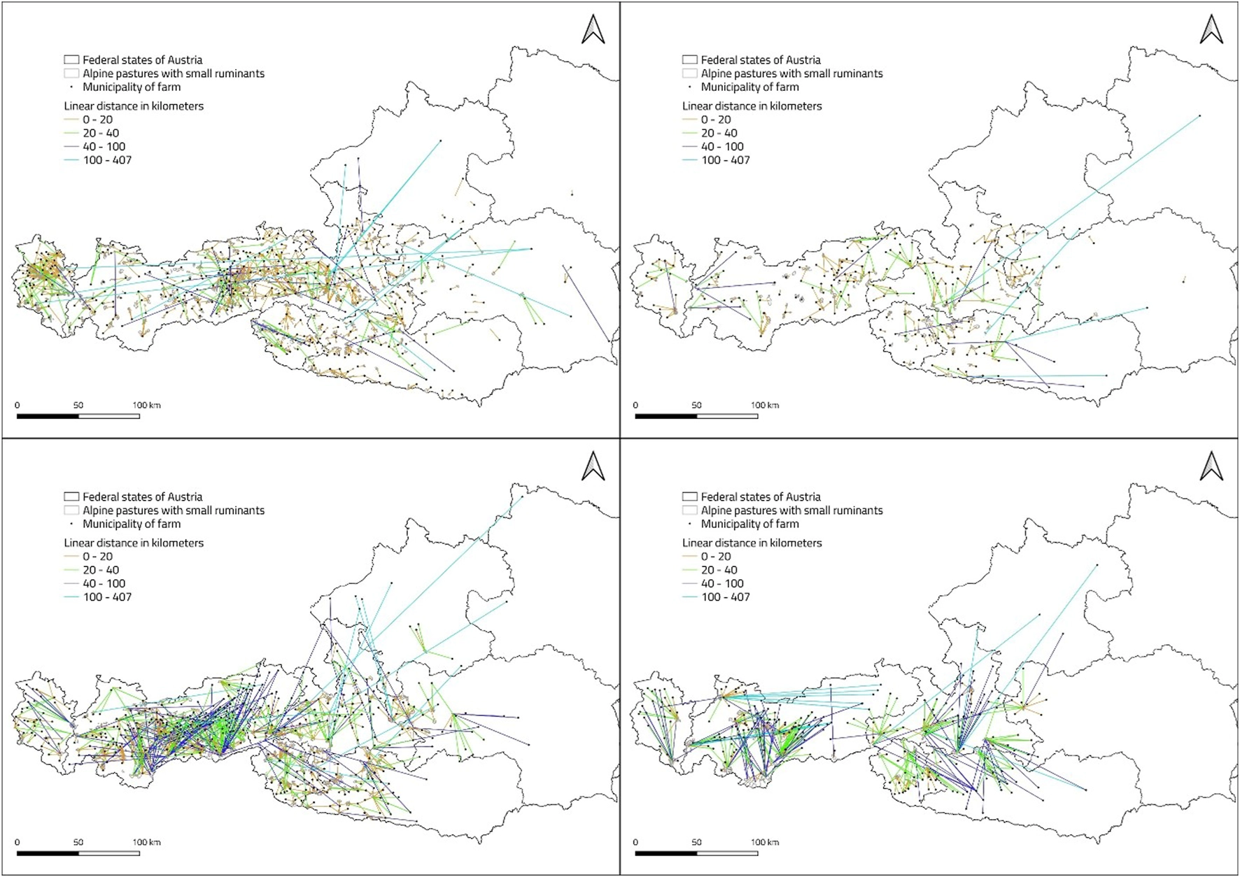 Farmers have to transport their animals to the alpine pastures, mostly over short distances (Figure 3). On alpine pastures with up to 500 head of livestock, around 80%–90% of farms are located within 20 km. On alpine pastures with more than 500 SmRu, about 85% of the holdings are located within 40 km.