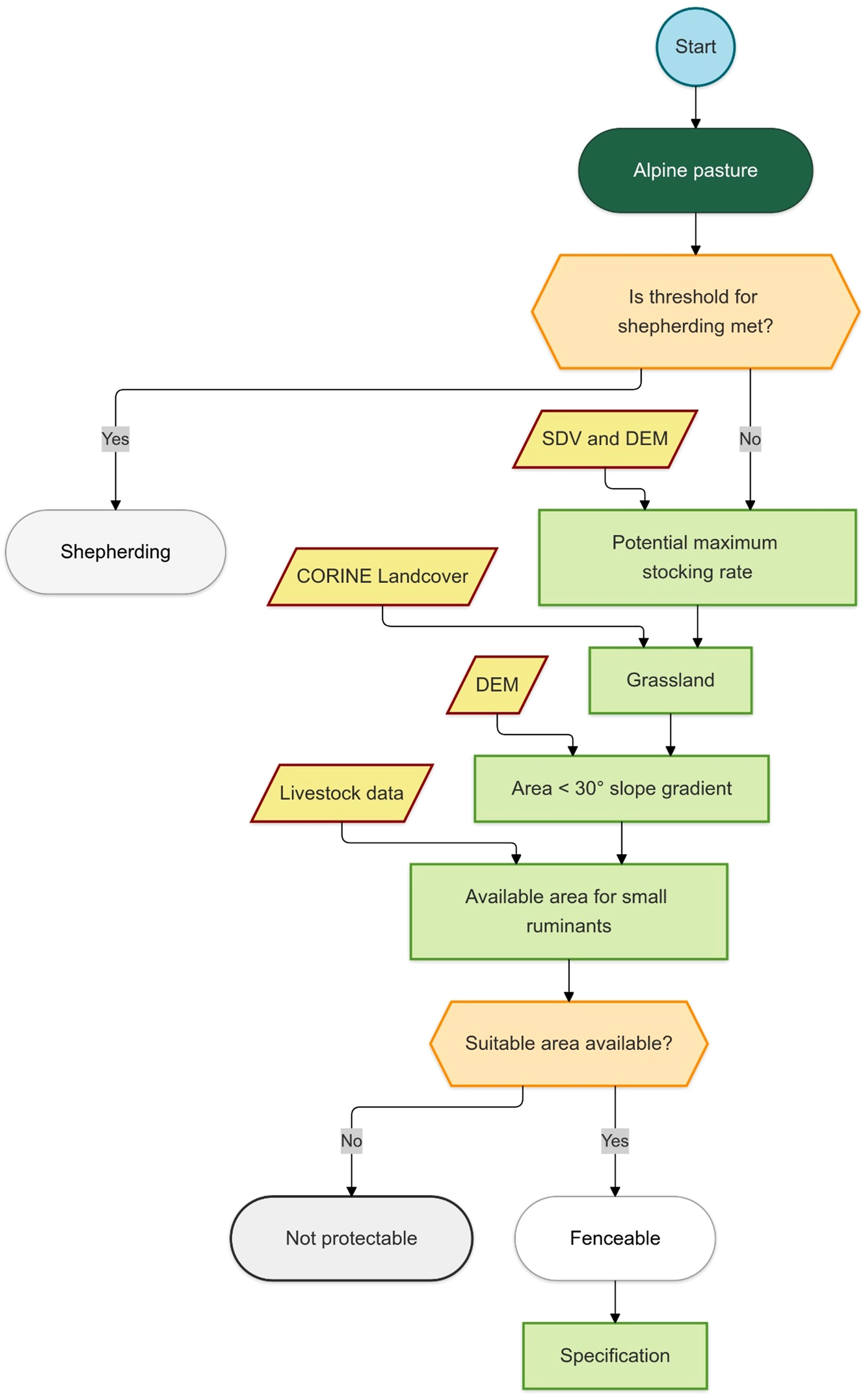 Various algorithms for the protectability of Alpine pastures already exist in the German speaking part of the Alps. These are all very similar (LARK, 2021; LFU, 2021; Klinke et al., 2024). Due to criteria such as the currently low availability of shepherds and high initial costs they do not consider shepherding further. Only the methods of fencing and the use of livestock guard dogs are examined. In the case of fencing, it is assumed that entire Alpine pastures are fenced along their boundaries. Applying such criteria (LARK, 2021) for all Austrian pastures, four pastures with sheep and goats would be fenceable and five could be shepherded (Theresa Walter, unpublished).
