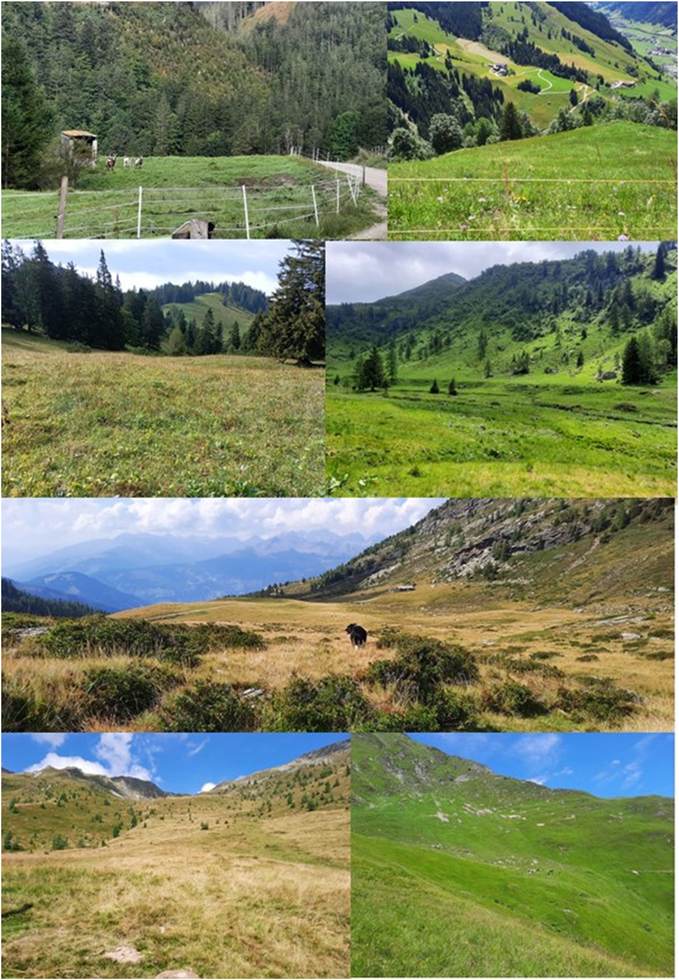 To validate the algorithm, a total of 22 alpine pastures in all three alpine regions were visited between June and September 2022 and 2024 (Table 3). The pastures were selected based on the frequencies of the categories in Table 2, with only slight deviations. Most of the pastures were visited in 2024. 10 out of 22 alpine pastures could be visited in the company of the pasture manager, owner or shepherd. We visited two pastures where shepherding was predicted as a suitable livestock protection measure. In the category “SmRu fenceable” 6, in the category “SmRu partly fenceable” 2, in the category “fenceable and shepherding” 2, in the category “cattle pasture but space left to fence in SmRu” 3 and in the category “not protectable” 7 alpine pastures were visited. Figure 6 gives an impression of the alpine pastures of the category “SmRu fenceable.” On most of the pastures the predicted measure could be proven, on 2 of the 22 visited pastures it was wrong. In one case this was due to the resolution of the CORINE Landcover and in the other case to the calculations with the values for less productive pastures.
