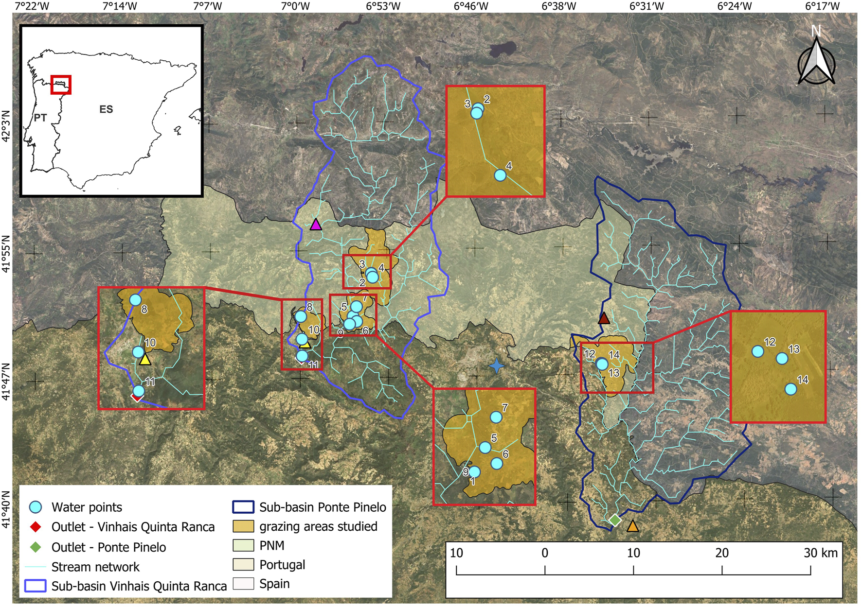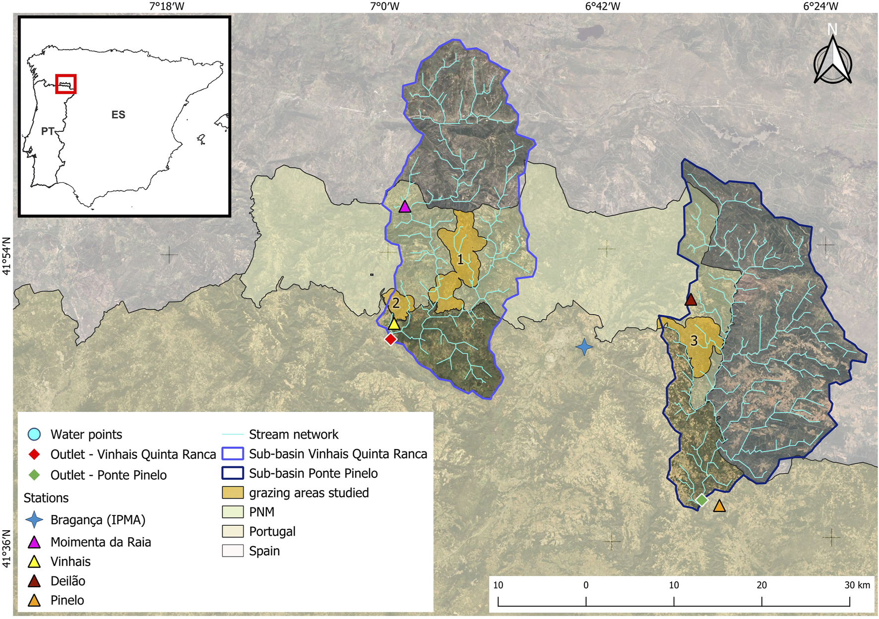 To assess the hydrological processes of the study area, the river basin was adopted as the spatial analysis unit, a scale widely used across soil and water conservation studies, as well as in water resource management (Wang et al., 2016). Specifically, two hydrographic sub-basins were delineated: the Tuela river sub-basin upstream of the “Vinhais Quinta Ranca” hydrometric monitoring station (BHVQR) and the Maçãs river sub-basin upstream of the “Ponte Pinelo” hydrometric station (BHPP). Both sub-basins have a transboundary character, originating in Spain and flowing into Portuguese territory. Importantly, the delineation of these sub-basins was carried out to ensure that the areas monitored for grazing activities are fully encompassed within the spatial analysis framework (Figure 1).