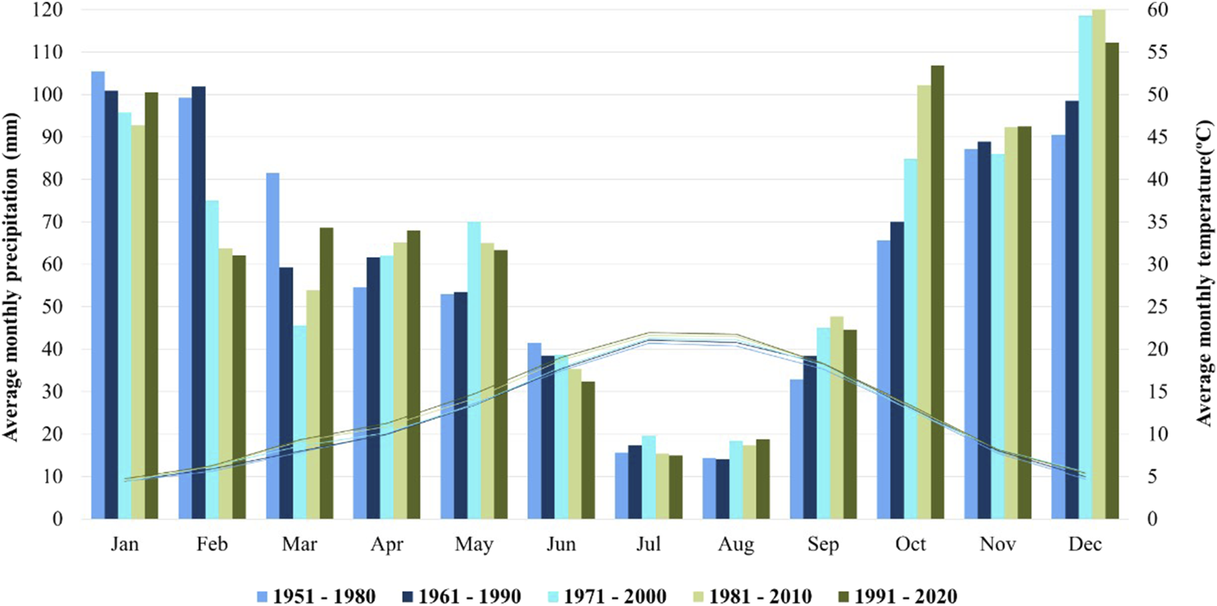 Climatological normals for precipitation and temperature were calculated to characterise the baseline climate conditions of the study area. Following the recommendations of the World Meteorological Organization (WMO, 2007), these normals were computed as average values over a standard reference period of 30 years. This approach provides a consistent climatic context for analysing hydrological processes and pastoral dynamics within the delineated sub-basins. Data was obtained from the online database of the Instituto Português do Mar e da Atmosfera (IPMA, 2023), specifically from the Bragança meteorological station (41°48′14″N, 6°44′34″W; 691 m altitude - Figure 1). This dataset was selected due to its robustness, completeness, and quality-controlled processing. A historical series of monthly precipitation and average temperature spanning 69 years (from 1951 to 2020) was used to calculate climatological normals over five distinct 30-year periods. These periods were 1951–1980 (T1), 1961–1990 (T2), 1971–2000 (T3), 1981–2010 (T4), and 1991–2020 (T5). Monthly average precipitation and temperature values were compiled for each period.