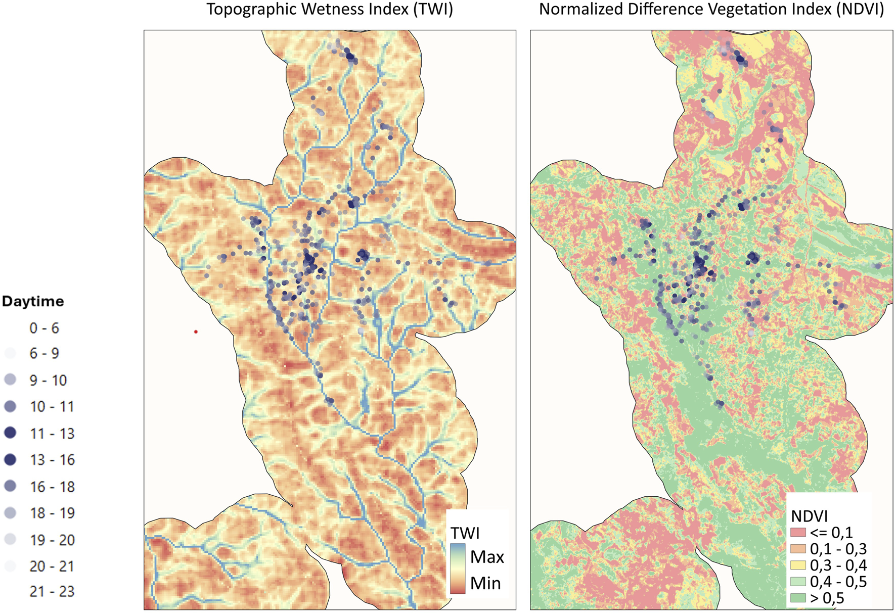 The next step involved producing spatialized maps of two key environmental indices: i) the Normalized Difference Vegetation Index (NDVI), and ii) the Topographic Wetness Index (TWI). The first one provides information on vegetation density and allowed us to assess the influence of forage availability and potential shading for the herds during particularly hot periods. The second identifies areas with greater or lesser potential for water accumulation (Kirkby, 1975; Beven and Kirkby, 1979), based on slope and upstream contributing area. This index enabled the identification of zones with higher soil moisture retention capacity and helped us understand spatial constraints related to water scarcity, especially during the summer.