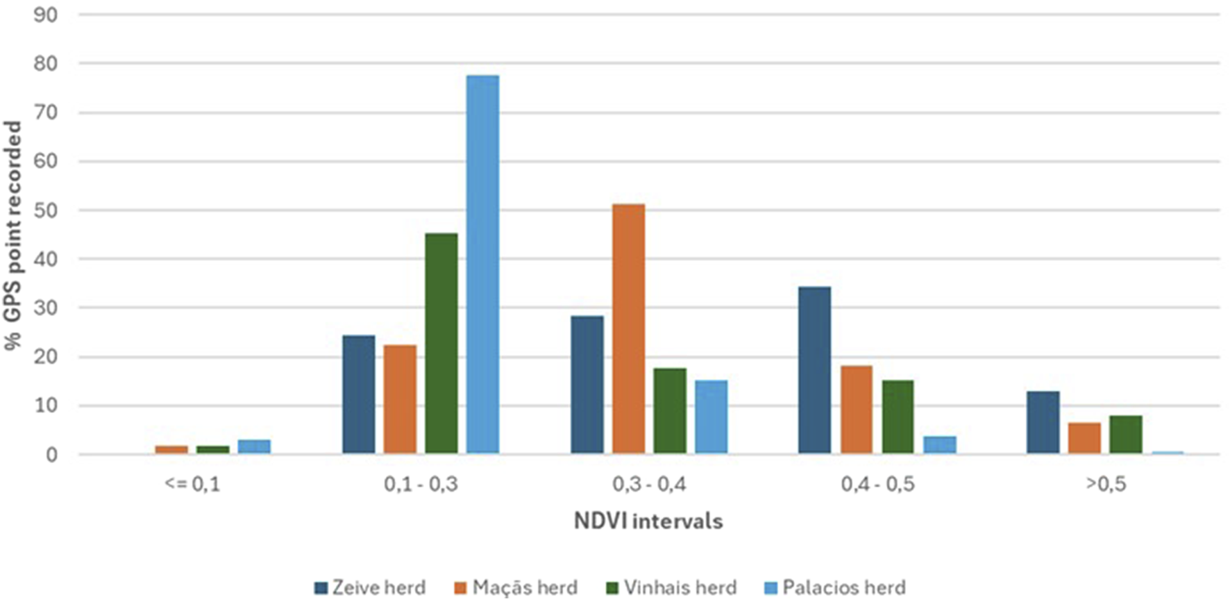 Despite the overall low vegetation density across the studied area, analysis of the recorded GPS data against NDVI values revealed a relative preference for areas with higher vegetation cover, particularly between 11:00 and 16:00, when solar radiation peaks (Figure 4). A higher concentration of GPS points was observed in NDVI intervals 0.1–0.3 and 0.3–0.4, and to a lesser extent in the 0.4–0.5 class and above.