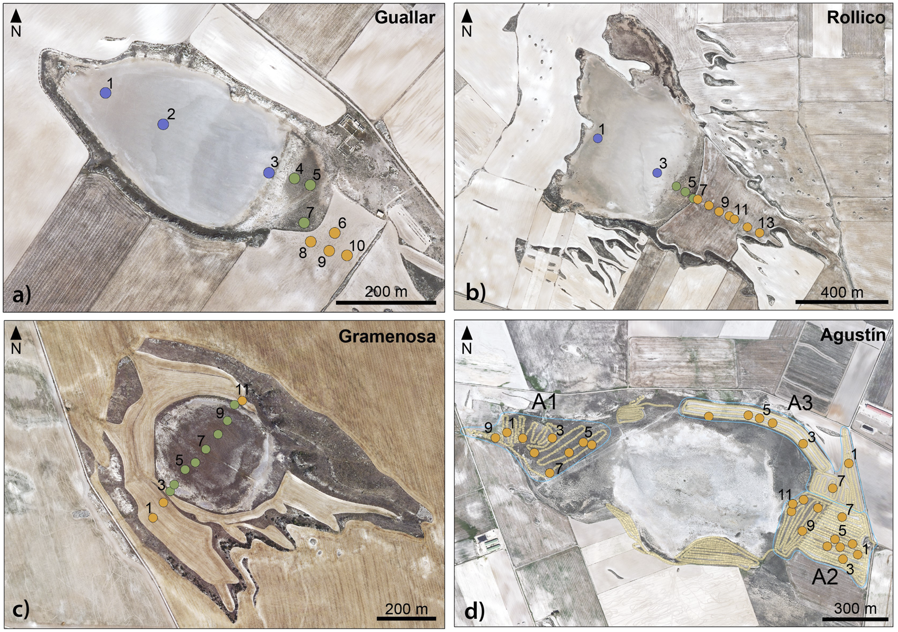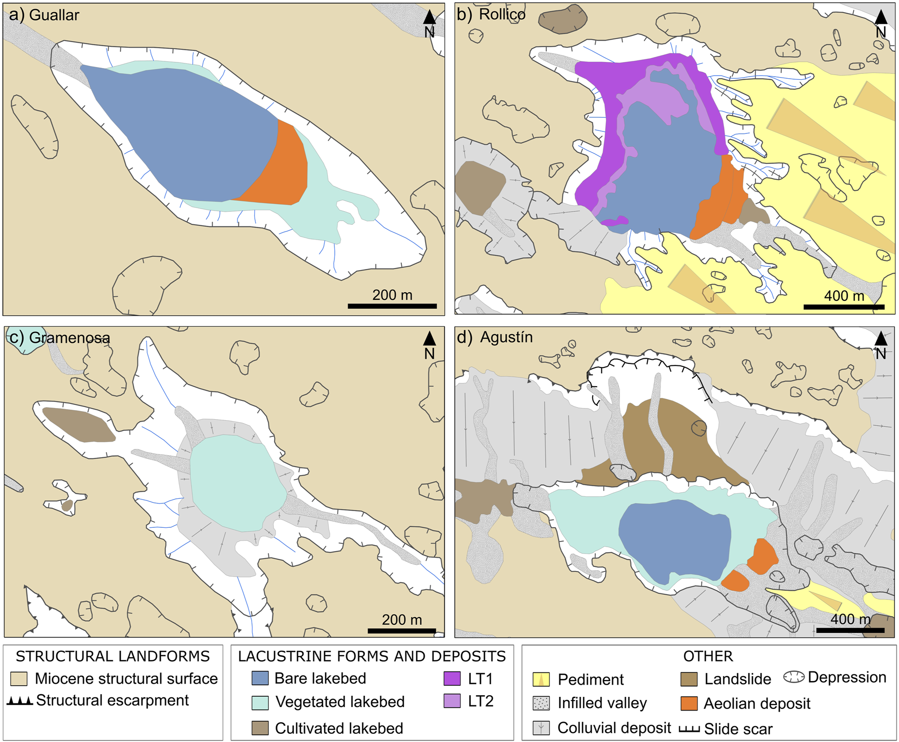 Rollico (Figure 3b) is inset within a relatively deep depression developed in the confluence of a wide structural surface developed to the NW and a pediment slope draining from the SW. The bare lakebed is enclosed by two lacustrine terraces, both of them less than 6Ā m high above the lake bottom, and by two adjacent aeolian deposits in the leeward zone. Gramenosa (Figure 3c) is part of a wider depression which includes a continuous colluvial deposit surrounding the main wetland and a small adjacent lakebed at the NW zone surrounded by vegetation. Agustin (Figure 3d) is located at the lowest topographic position of a complex area excavated into the largest flat-bottomed valley in the region, about 22Ā km long and 1.7Ā km of maximum width. The border of the depression hosting the wetland is blurred within the valley which includes a noticeable colluvium with a landslide to the north, together with small pediments. Leeward aeolian deposits are also present in the bottom of the depression.