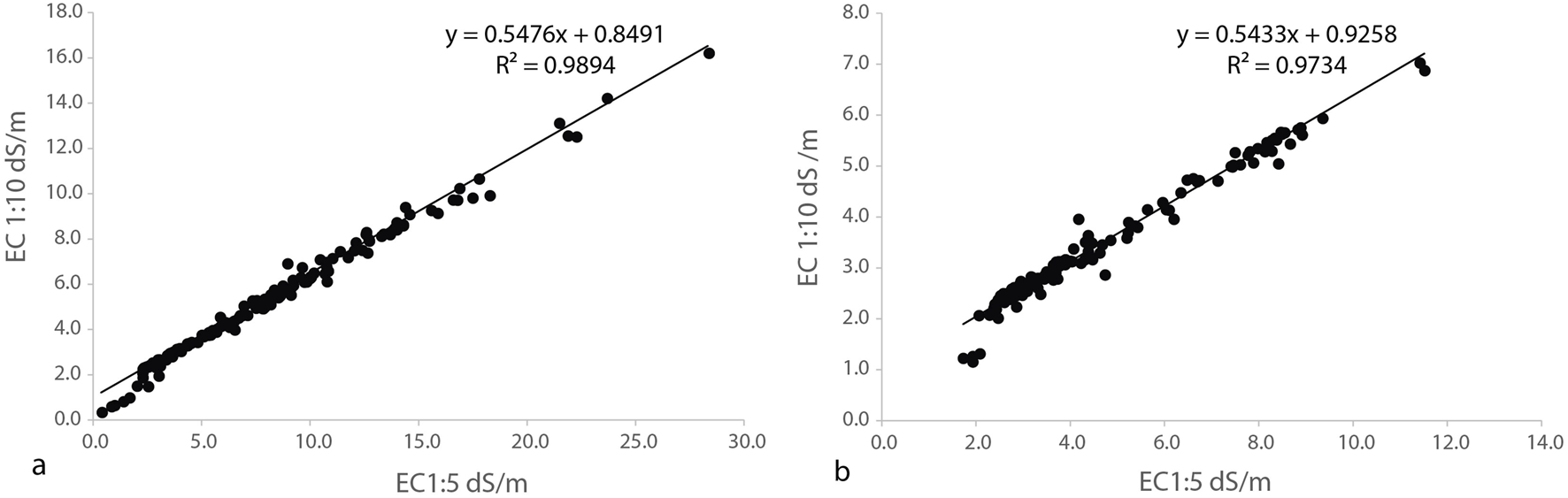 Regression of CE1:10 on EC1:5 in the soil transects (a) and the plots (b).