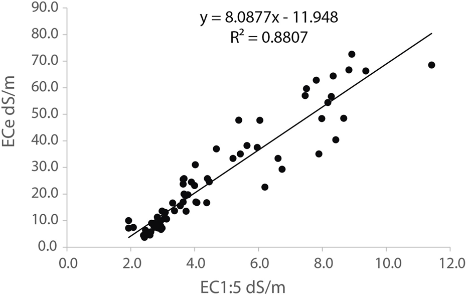 In Agustin plots, the regression of ECe on CE1:5 for the 69 samples with both determinations gives a determination coefficient of 88% (Figure 5), and a standard error of 6.8Ā dS mā1 and allows to estimate the ECe for all the Agustin samples with Equation 1: