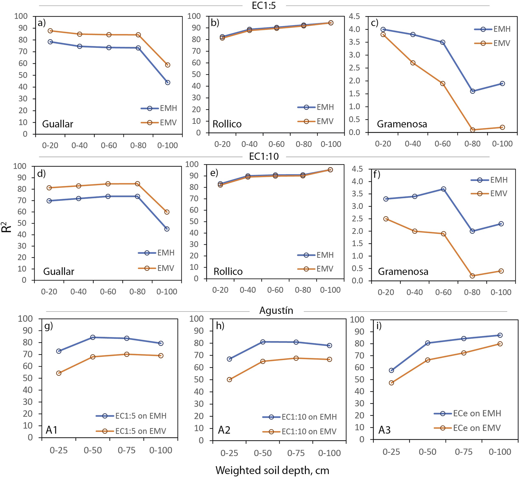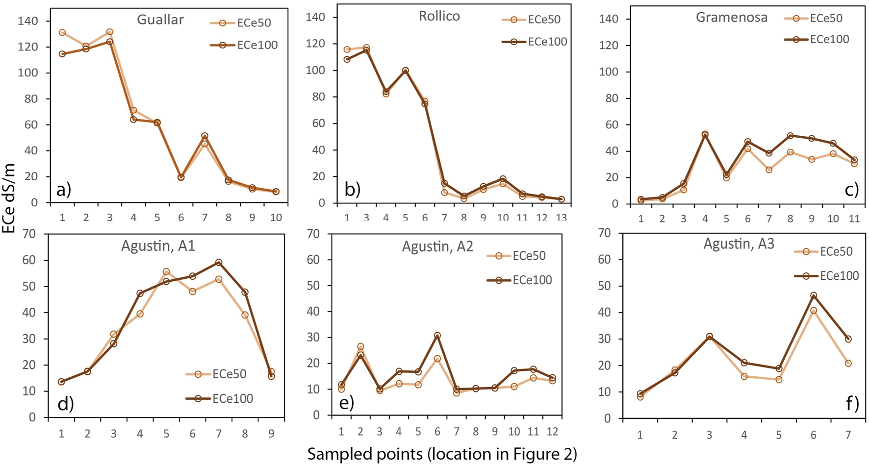 EC1:5 profiles of soils sampled in Guallar (a), Rollico (b), Gramenosa (c), and AgustĆn plots A1 (d), A2 (e) and A3 (f).