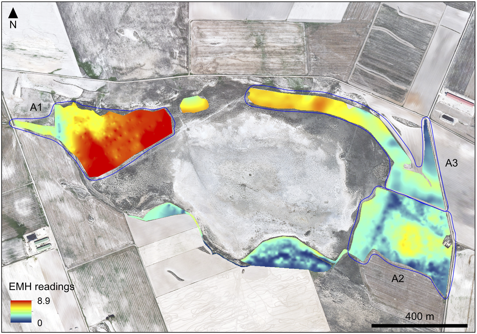 The Saladas of SĆ”stago-Bujaraloz in Monegros are saline wetlands with alternating inundation and drying episodes and with a water salinity in some of their bottoms 10 times higher than that of the sea water. Their water regime, together with their chemical characteristics and semiarid climate (Herrero and Snyder, 1997), make possible a unique vegetation, unparalleled in Europe (Conesa et al., 2011; FAO, 2024). These closed depressions scattered in the landscape were surrounded by rainfed winter cerealsāmainly barley (Hordeum vulgare L.)ā as far as the topography and the soil salinity allow, and often with crops sowed even within the wetland depressions. Yields, controlled by the scarce and variable seasonal rainfall, are very irregular (McAneney and ArrĆŗe, 1993; CastaƱeda and Moret-FernĆ”ndez, 2013). The socioeconomic scenario was modified by European Union subsidies and the prospects of conversion to irrigation. Protected saline habitats are sensitive to land use changes at the wetland-crop interface and could be affected by agricultural actions, in some cases with the main objective of earning subsidies. The protection of saladas ought to consider the extent and variability of salinity not only in their bottoms, but also in surrounding agricultural soils.