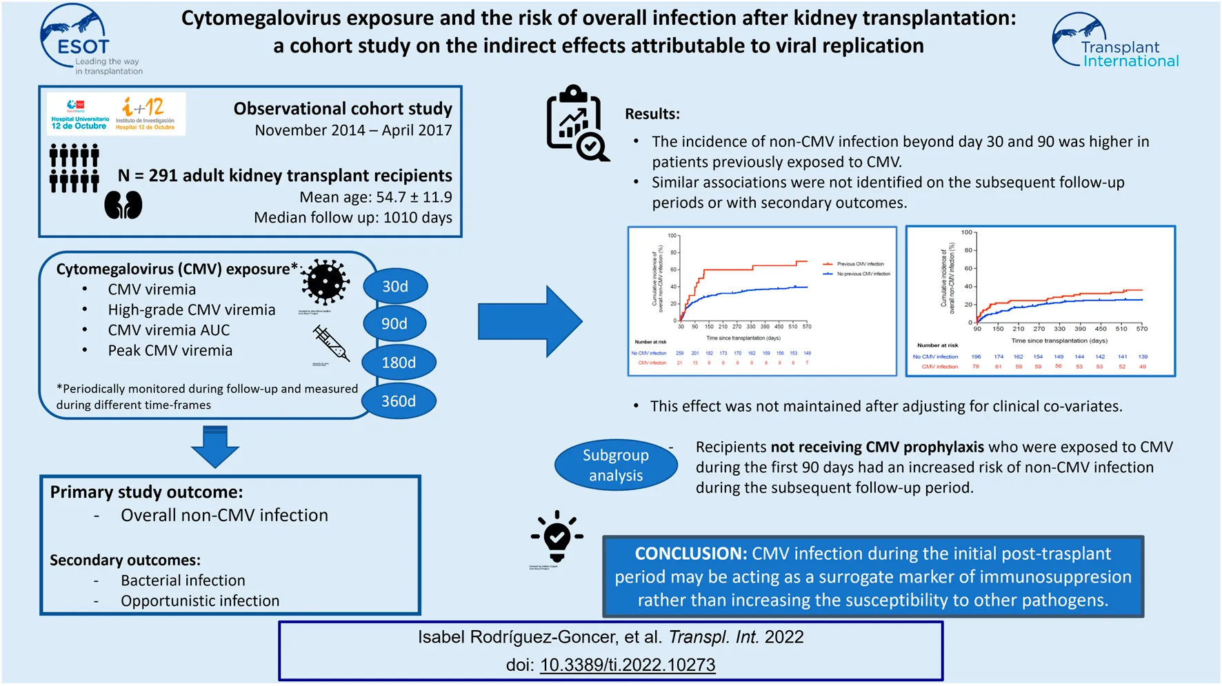 Rodríguez-Goncer I, Ruiz-Ruigómez M, López-Medrano F, Trujillo H, González E, Polanco N, Gutiérrez E, San Juan R, Corbella L, Ruiz-Merlo T, Parra P, Folgueira MD, Andrés A, Aguado JM and Fernández-Ruiz M (2022) Cytomegalovirus Exposure and the Risk of Overall Infection After Kidney Transplantation: A Cohort Study on the Indirect Effects Attributable to Viral Replication. Transpl Int 35:10273. doi: 10.3389/ti.2021.10273