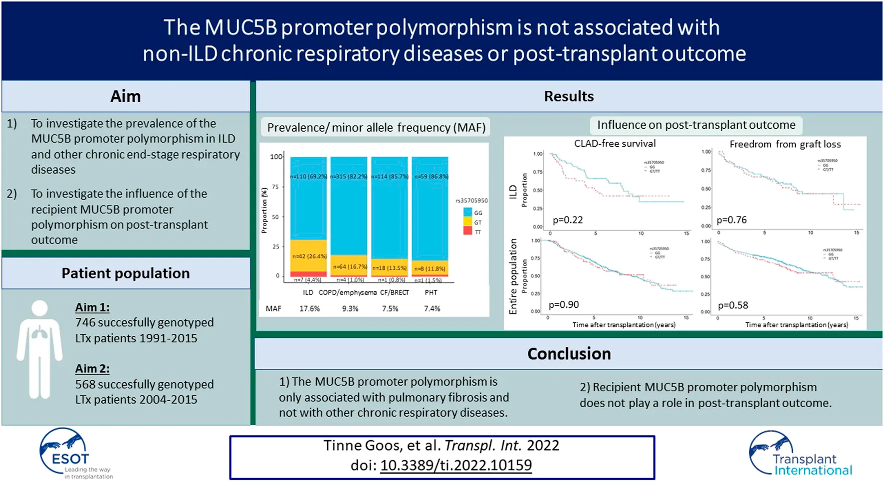 Goos T, Verleden SE, De Sadeleer LJ, Van Herck A, Sacreas A, Vanstapel A, Kaes J, Geudens V, Aelbrecht C, Ruttens D, Lambrechts D, Vermeer S, Ceulemans LJ, Van Raemdonck DE, Godinas L, Yserbyt J, Vanaudenaerde BM, Verleden GM, Vos R and Wuyts WA (2022) The MUC5B Promoter Polymorphism is Not Associated With Non-ILD Chronic Respiratory Diseases or Post-transplant Outcome. Transpl Int 35:10159. doi: 10.3389/ti.2022.10159