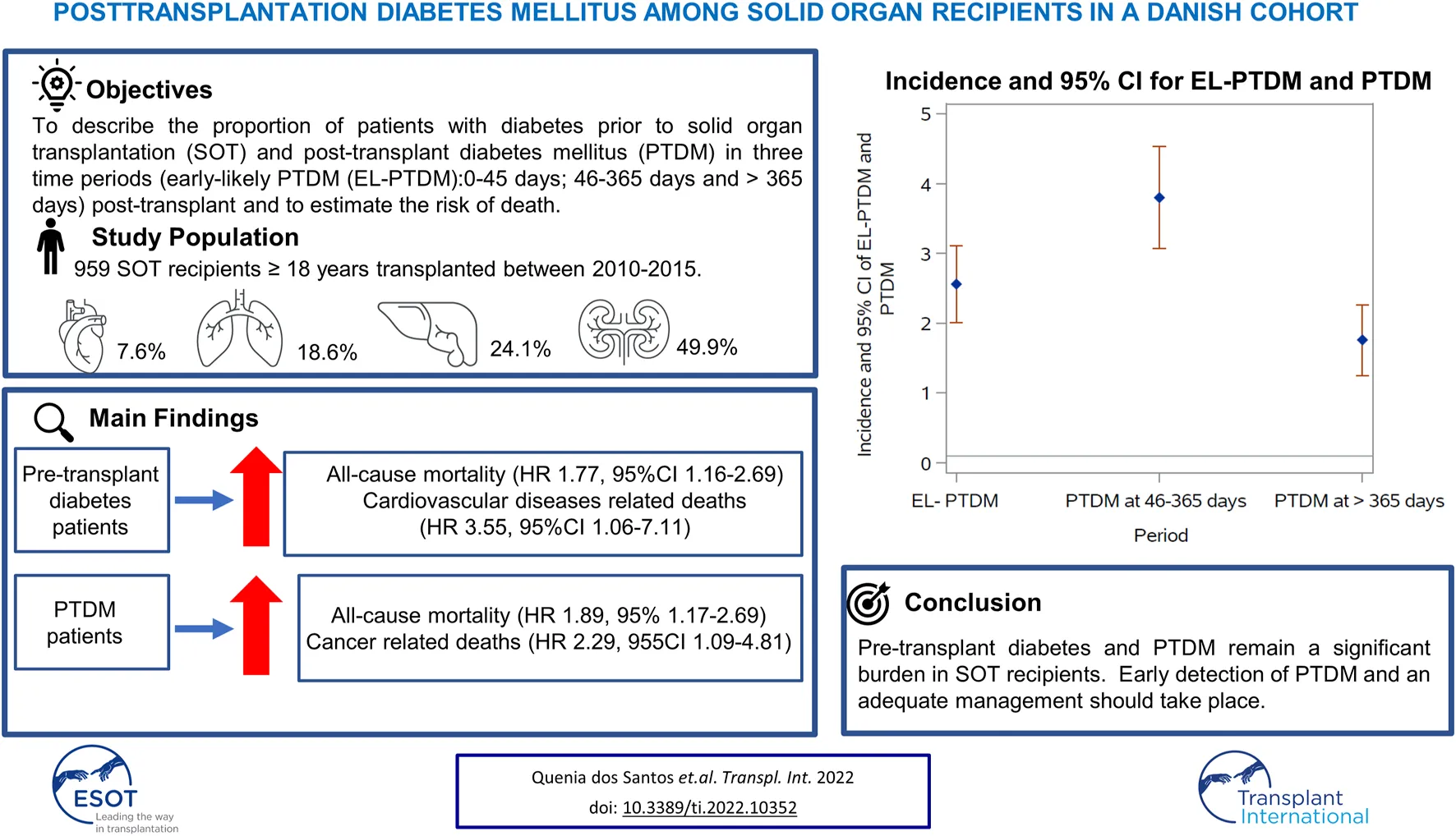 Dos Santos Q, Hornum, Terrones-Campos C, Crone CG, Wareham NE, Soeborg A, Rasmussen A, Gustafsson F, Perch M, Soerensen SS, Lundgren J, Feldt-Rasmussen and Reekie J (2022) Posttransplantation Diabetes Mellitus Among Solid Organ Recipients in a Danish Cohort. Transpl Int 35:10352. doi: 10.3389/ti.2022.10352
