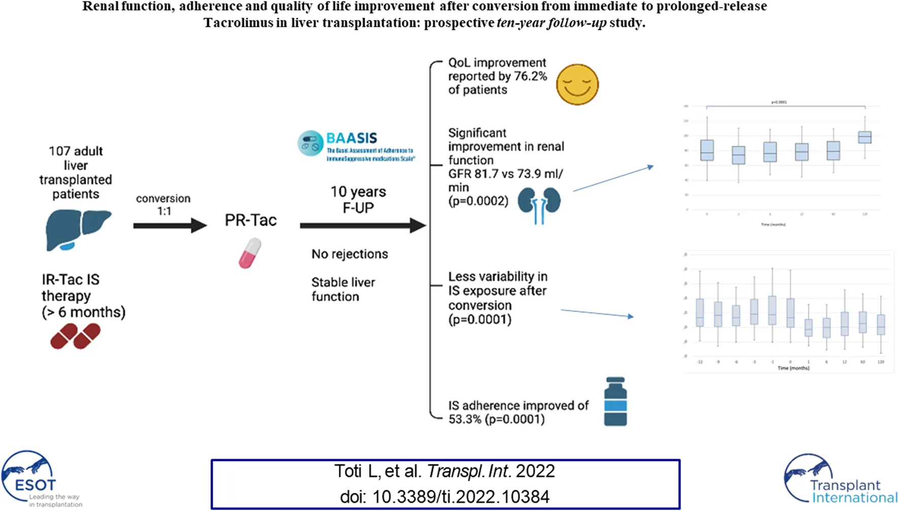 Toti L, Manzia TM, Blasi F, Lenci I, Baiocchi L, Toschi N and Tisone G (2022) Renal Function, Adherence and Quality of Life Improvement After Conversion From Immediate to Prolonged-Release Tacrolimus in Liver Transplantation: Prospective Ten-Year Follow-Up Study. Transpl Int 35:10384. doi: 10.3389/ti.2022.10384