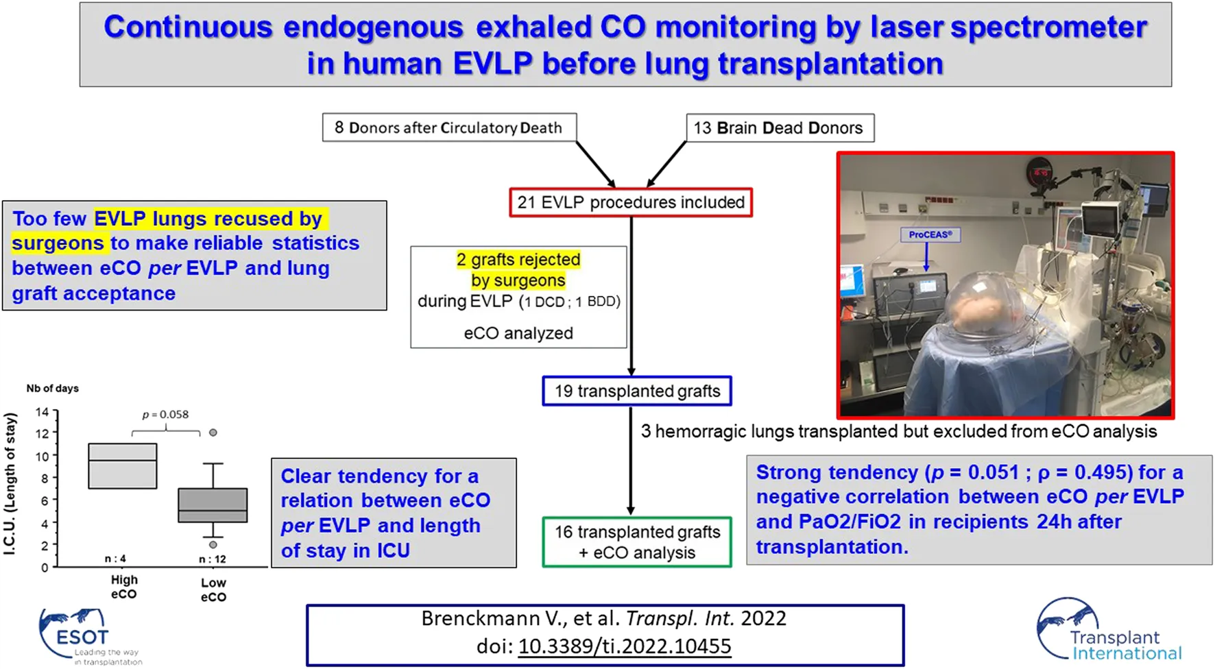BDD, brain dead donors; CO, carbon monoxide; eCO, endogenous exhaled carbon monoxide; DCD, donor after circulatory death; ECMO, extra corporeal membrane oxygenation; EVLP, ex-vivo lung perfusion; HO, heme oxygenase; IL, interleukine; ISHLT, International Society for Heart and Lung Transplantation; OF-CEAS, optical-Feedback cavity-enhanced absorption spectroscopy; PGD, primary graft dysfunction; ppm, parts per million; TNF, tumoral necrosis factor.