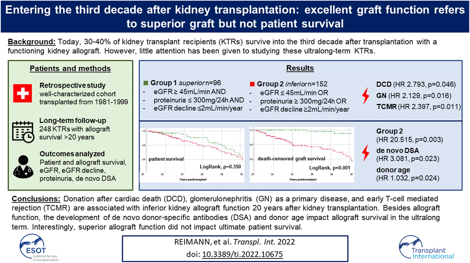 Reimann AV, Nilsson J, Wuethrich RP, Mueller TF and Schachtner T (2022) Entering the Third Decade After Kidney Transplantation: Excellent Graft Function Refers to Superior Graft but Not Patient Survival. Transpl Int 35:10675. doi: 10.3389/ti.2022.10675
