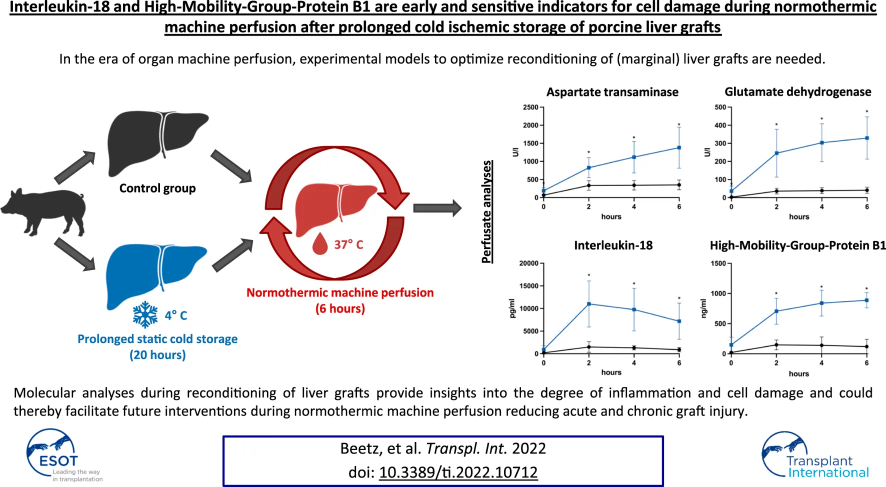 Beetz O, Cammann S, Weigle CA, Sieg L, Eismann H, Johanning K, Falk CS, Krech T, Oldhafer F and Vondran FWR (2022) Interleukin-18 and High-Mobility-Group-Protein B1 are Early and Sensitive Indicators for Cell Damage During Normothermic Machine Perfusion after Prolonged Cold Ischemic Storage of Porcine Liver Grafts. Transpl Int 35:10712. doi: 10.3389/ti.2022.10712